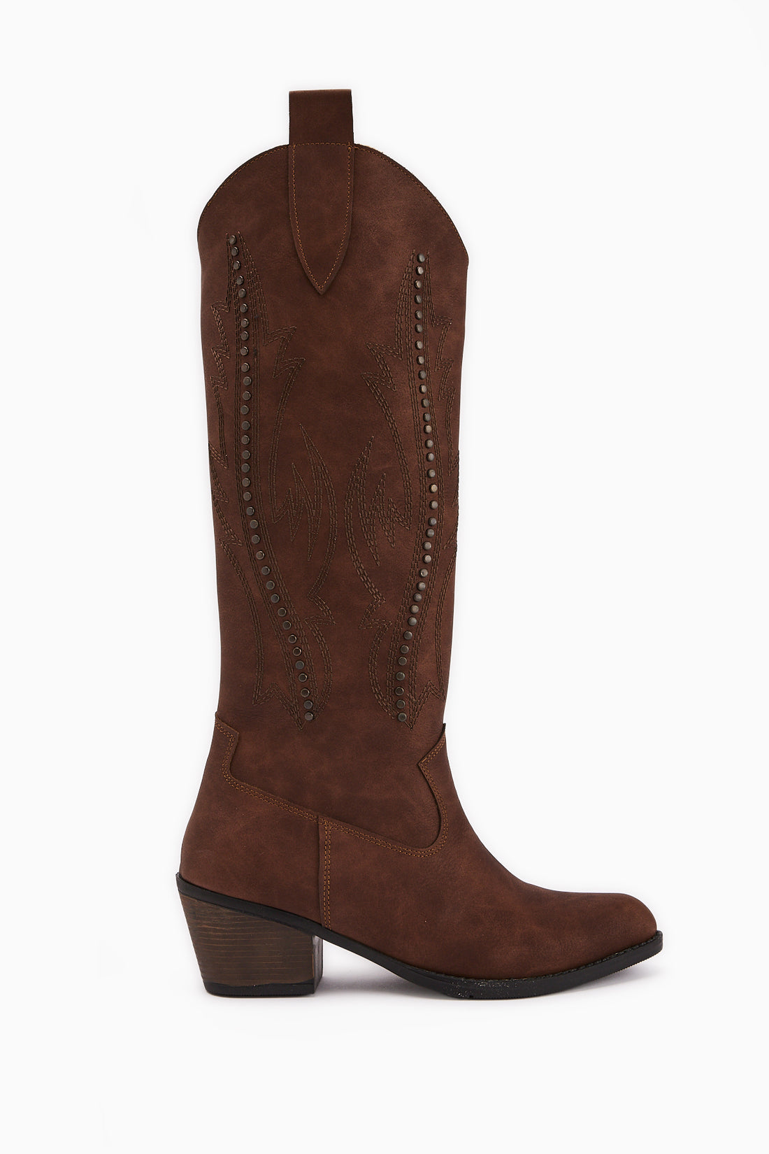 Fizaro Kahve Sivri Burunlu Nakışlı Zımba Detaylı Western Çizme