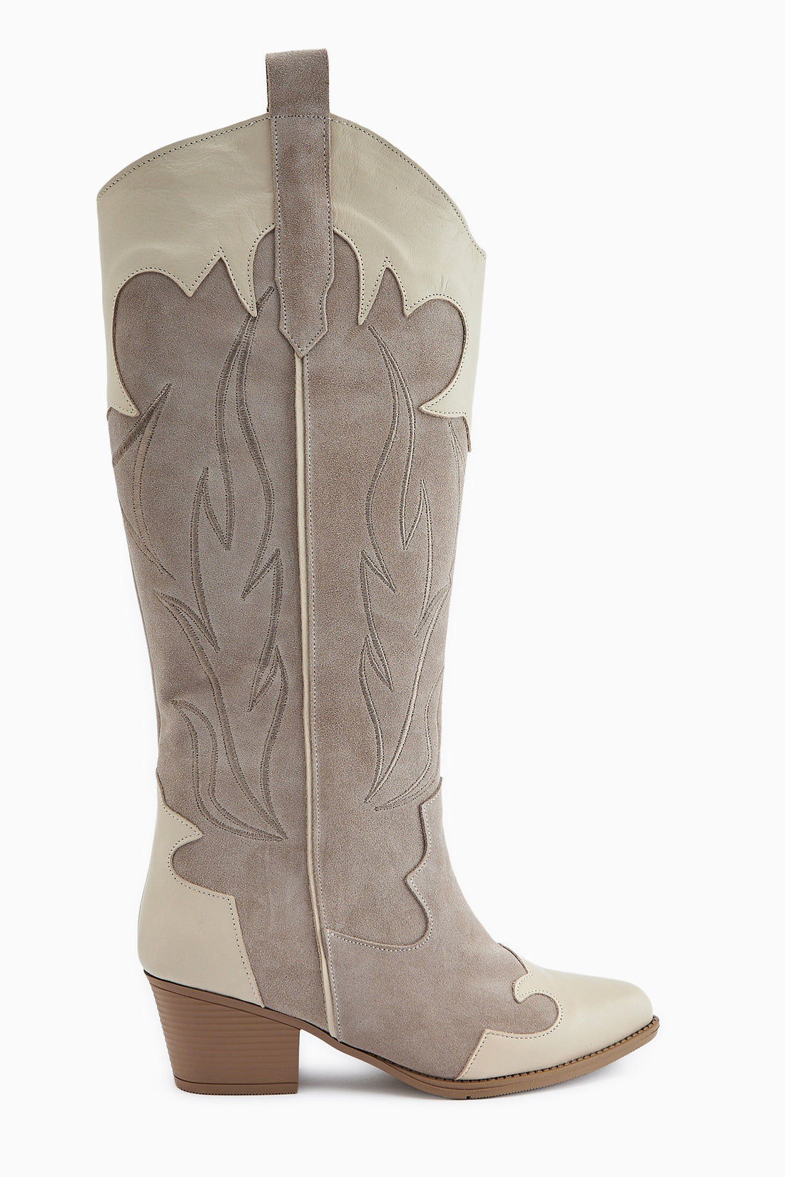 Lara Hakiki Deri Bej Süet Nakışlı Deri Detaylı Topuklu Western Çizme