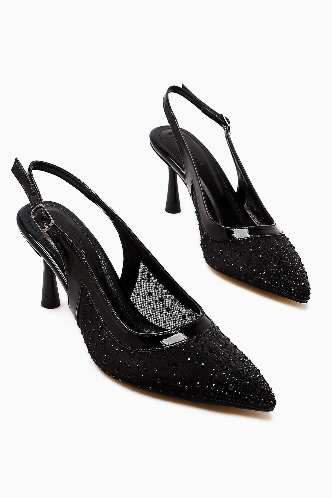 Kally Siyah Transparan Kumaş Taş Detaylı Kadın Topuklu Ayakkabı