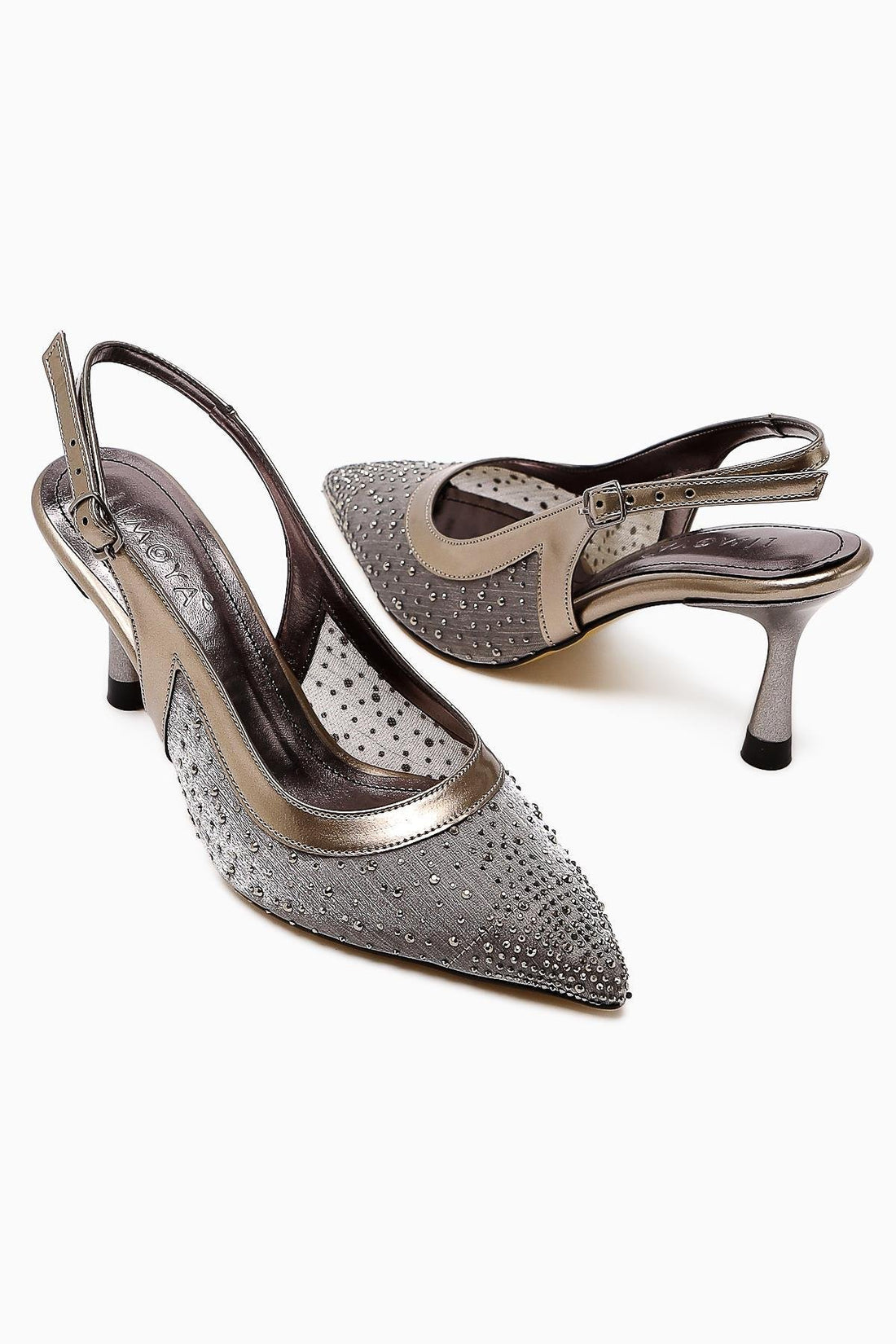 Kally Platin Transparan Kumaş Taş Detaylı Kadın Topuklu Ayakkabı