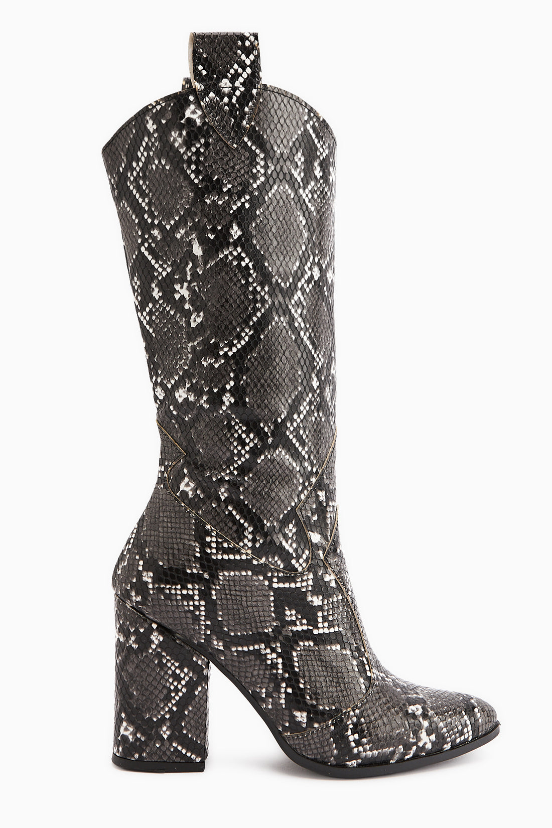 Keri Siyah Yılan Desenli Asimetrik Kesim Topuklu Kısa Çizme