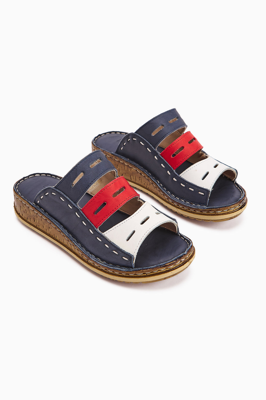 Hakiki Deri Joelle Lacivert Kırmızı Beyaz Comfort Lazer Kesim Terlik