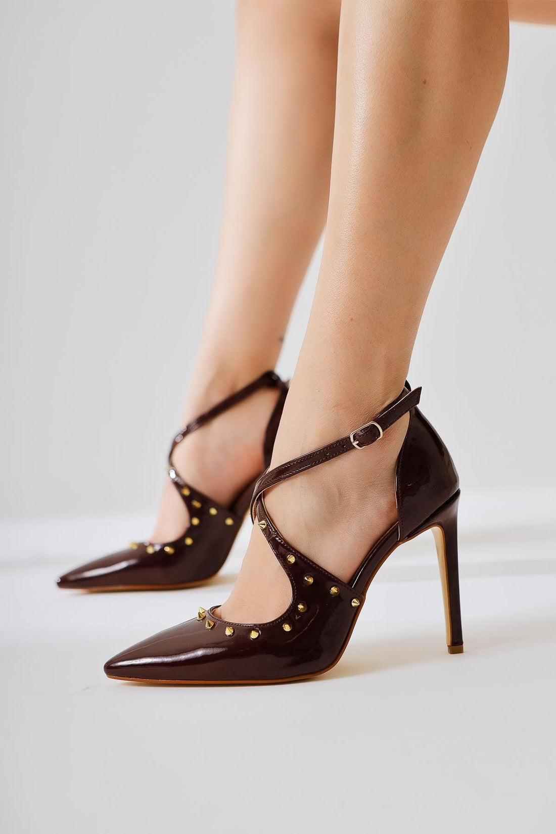 Tinde Bordo Sivri Burunlu Perçin Detaylı İnce Topuklu Ayakkabı