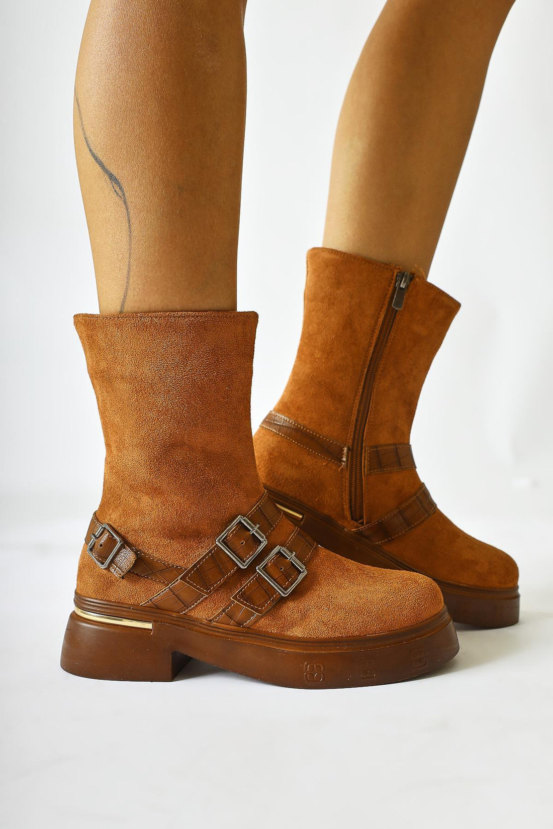 Mieke Taba Süet Çift Kemerli Fermuarlı Bot