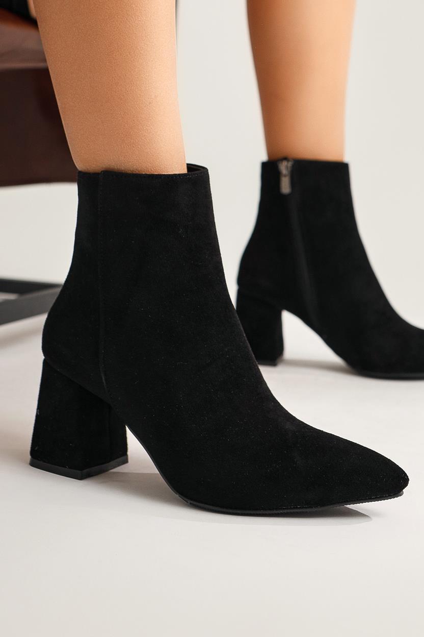 Ann Karin Siyah Süet Sivri Burunlu Fermuarlı Topuklu Bot