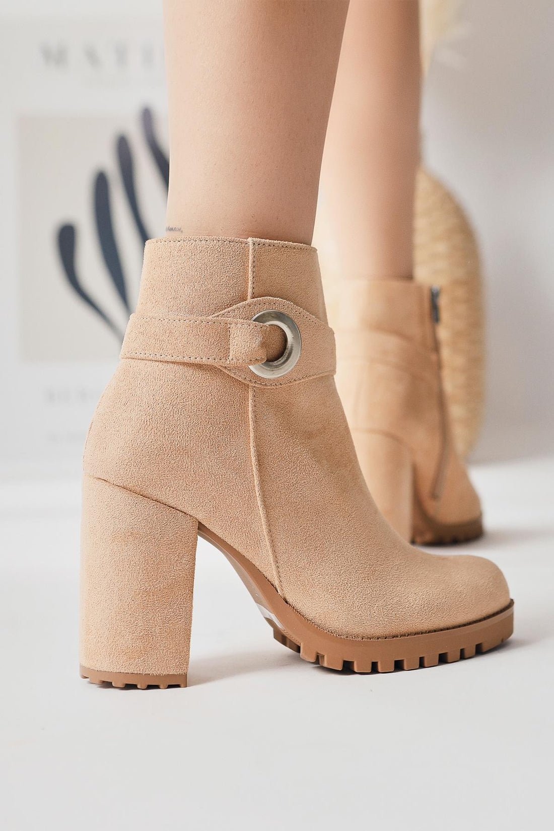 Destina Krem Süet Oval Burunlu Bilek Aksesuarlı Topuklu Bot