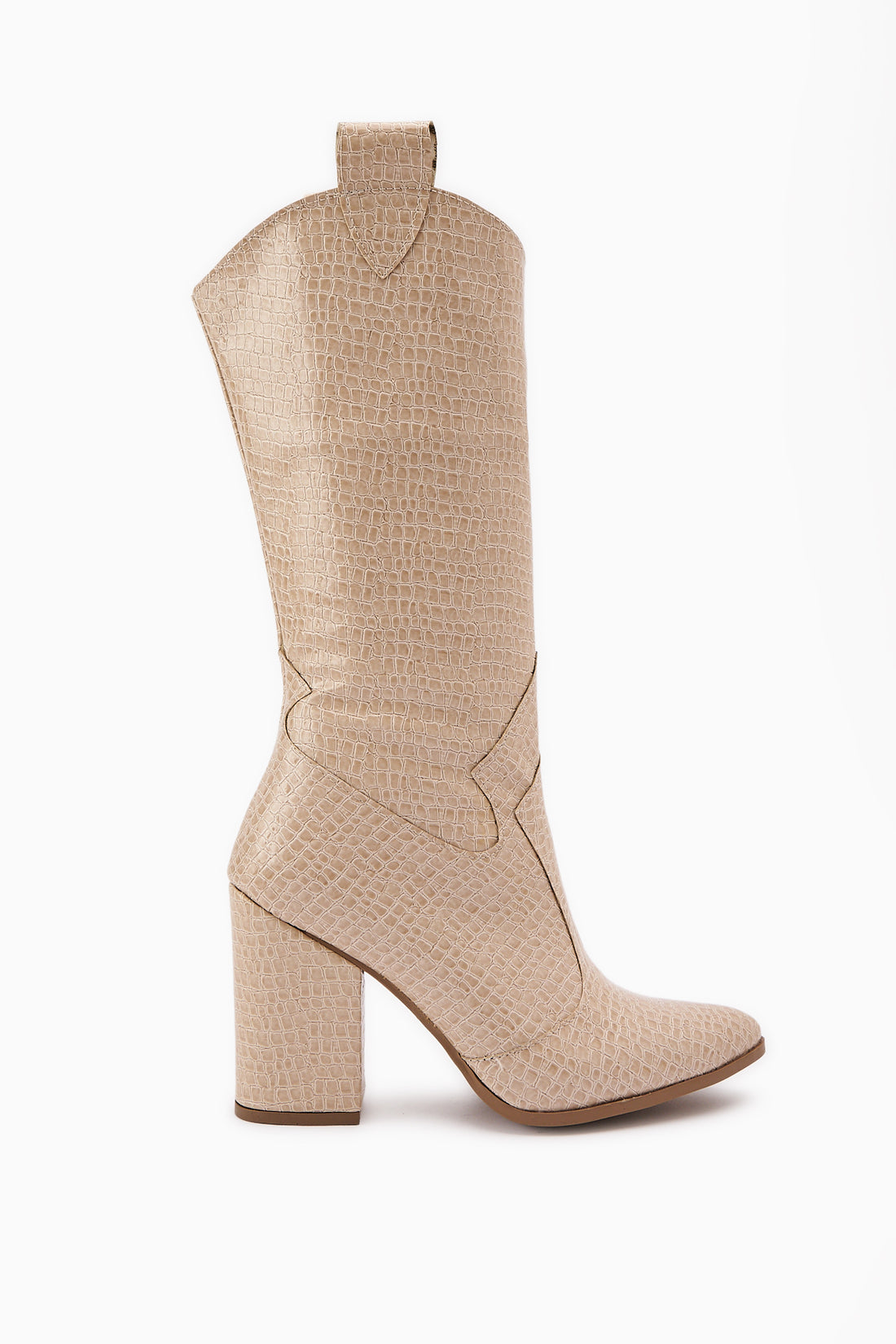 Keri Bej Kroko Asimetrik Kesim Topuklu Kısa Çizme
