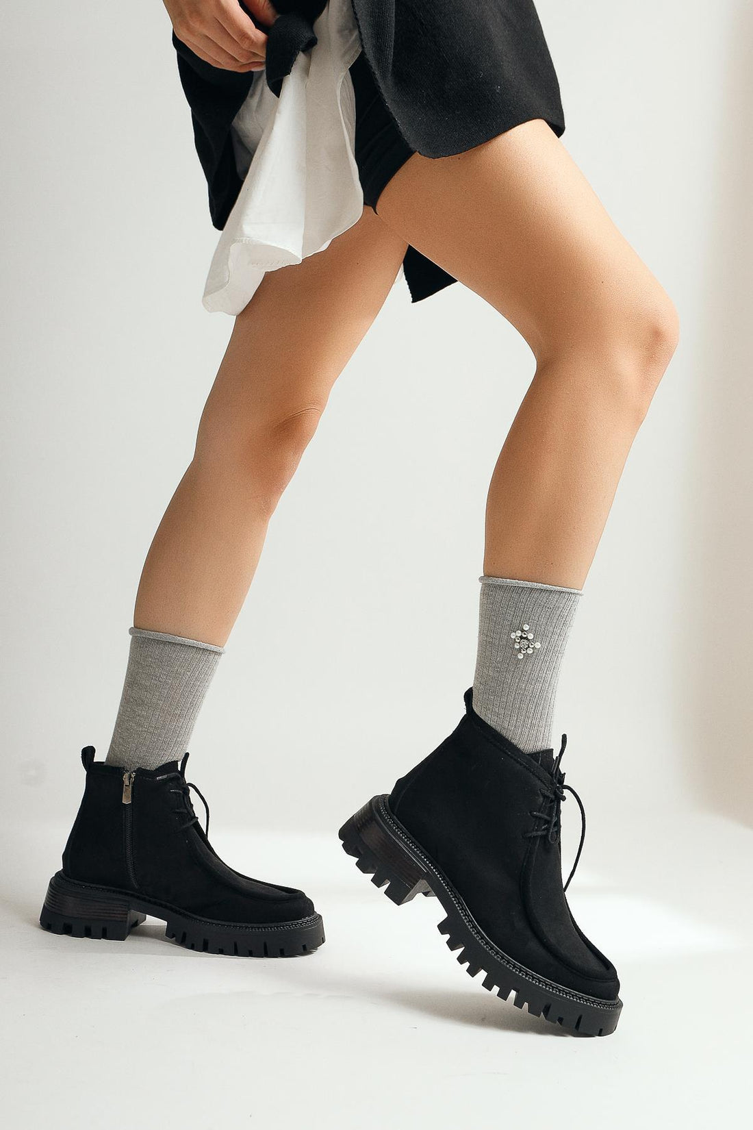 Venetia Siyah Süet Oval Burunlu Bağcıklı Bot
