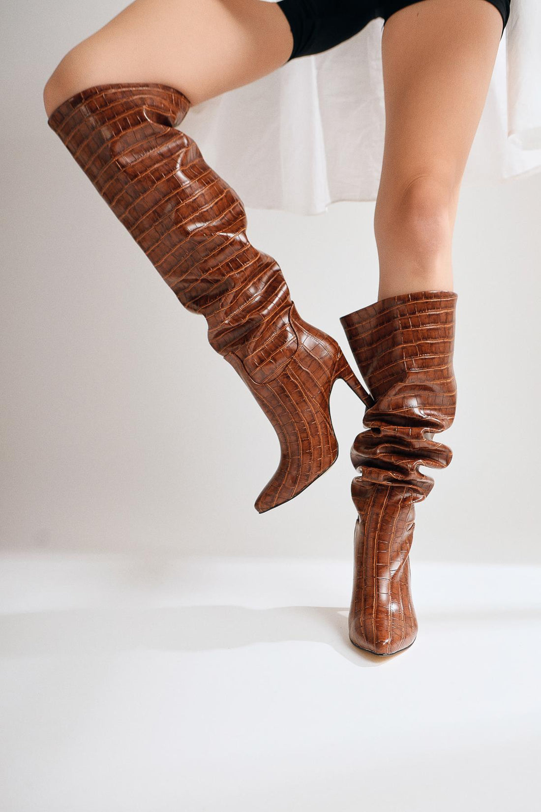 Nenya Taba Kroko Desenli Sivri Burunlu İnce Topuklu Dizüstü Çizme