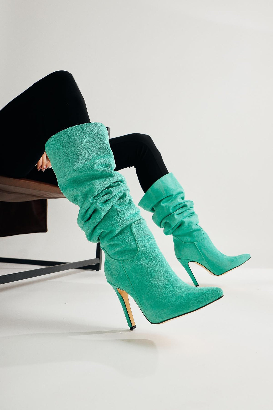Nenya Yesil Süet Desenli Sivri Burunlu İnce Topuklu Dizüstü Çizme