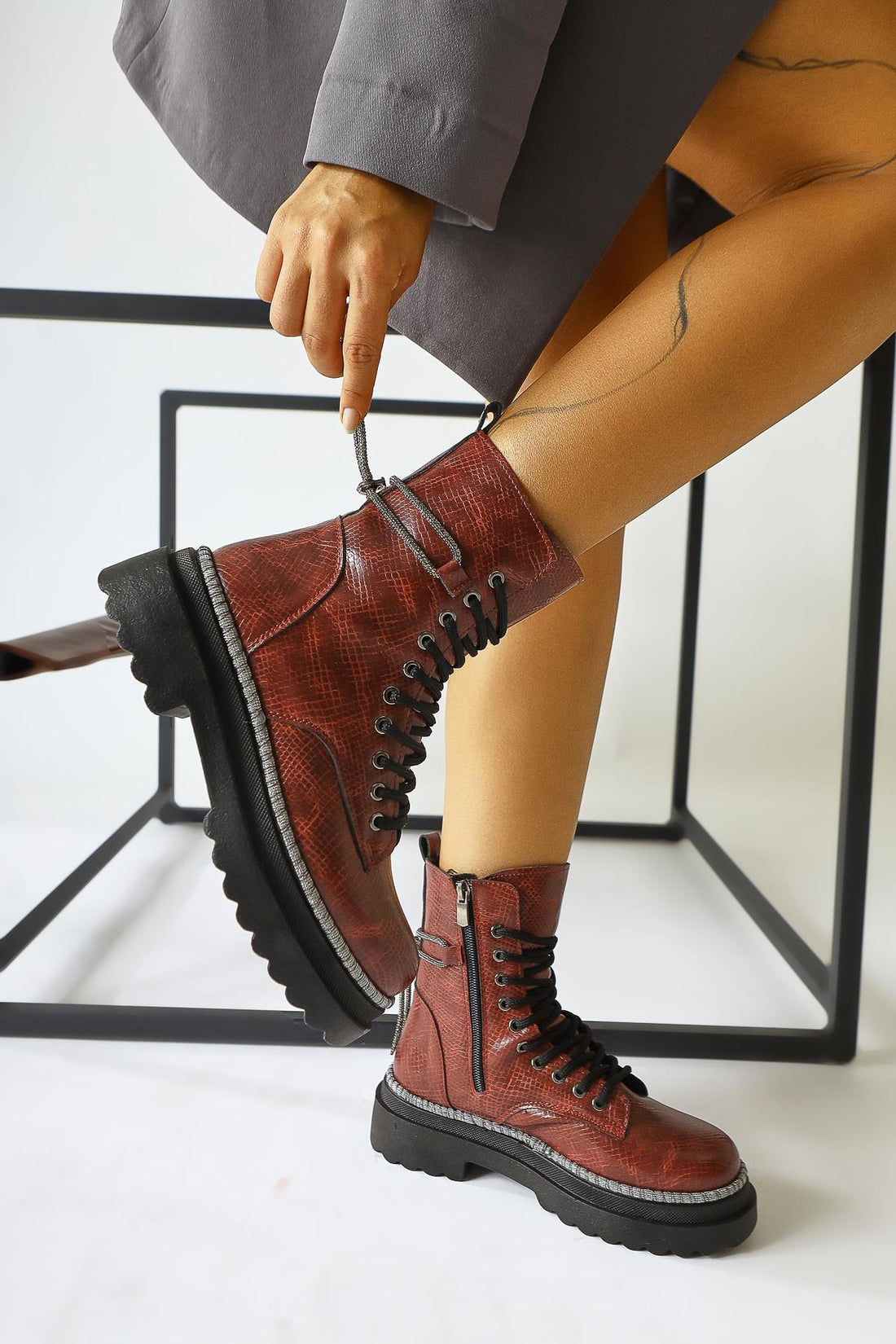 Dylan Bordo Parlak Biyeli Bilek Askesuarlı Postal