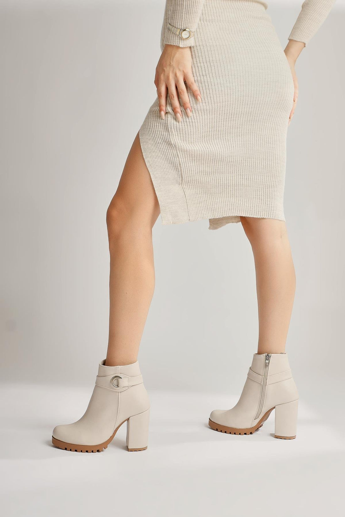 Destina Bej Oval Burunlu Bilek Aksesuarlı Topuklu Bot
