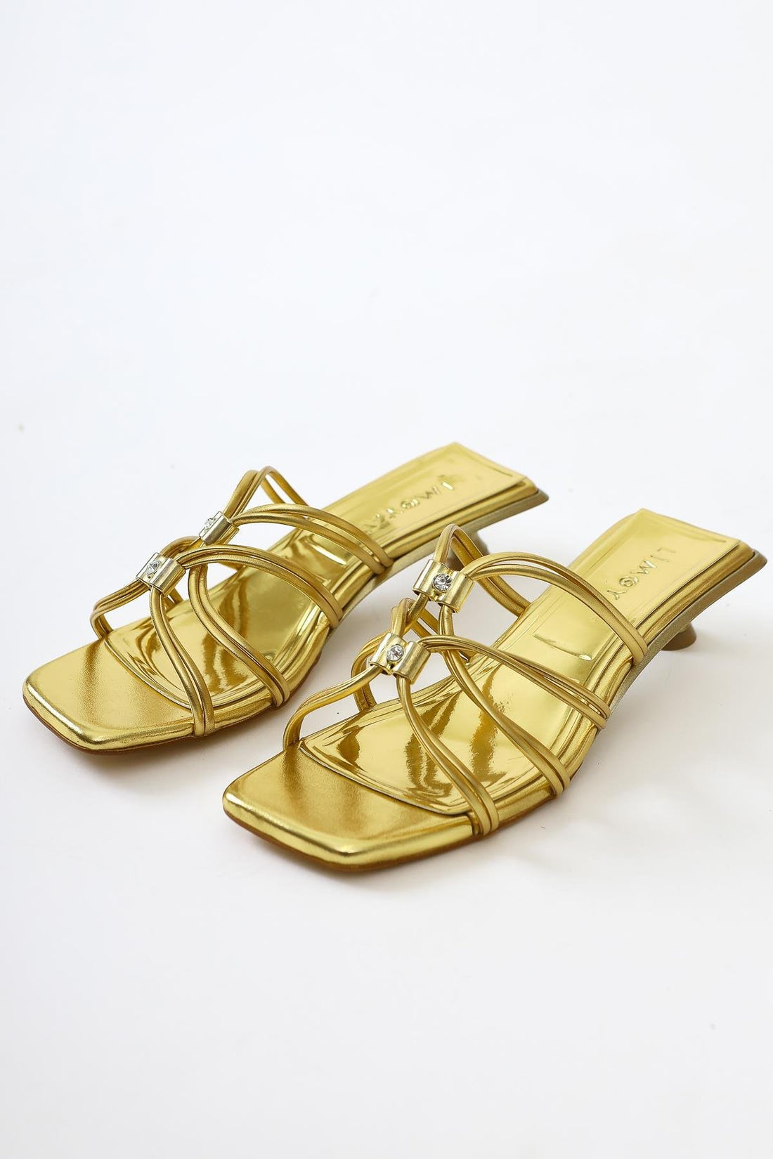 Seyda Altın Rugan İnce Bantlı Taş Detaylı Kısa Topuklu Terlik