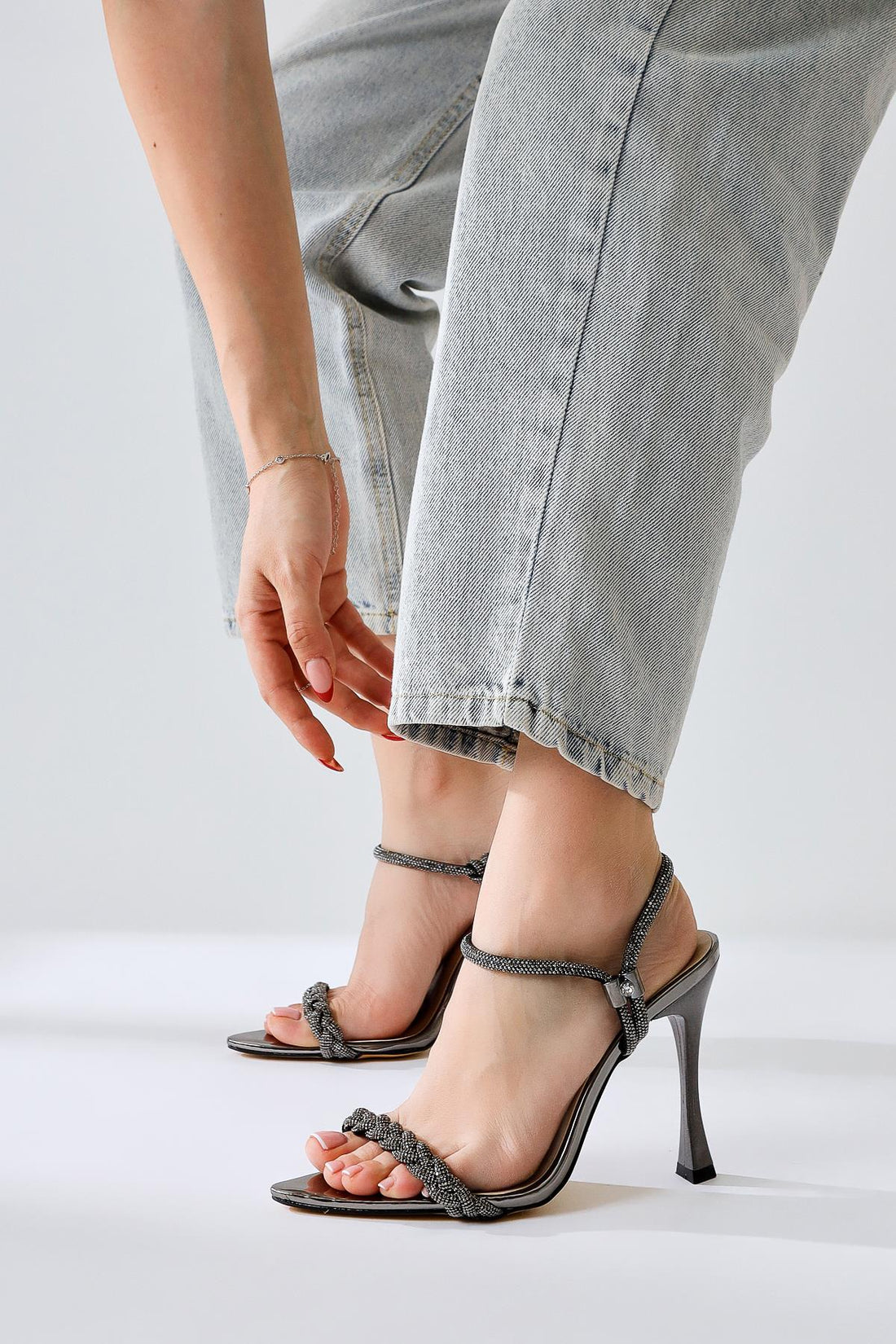 Marylou Platin İnce Bantlı Yaprak Taş Detaylı İnce Yüksek Topuklu Sandalet
