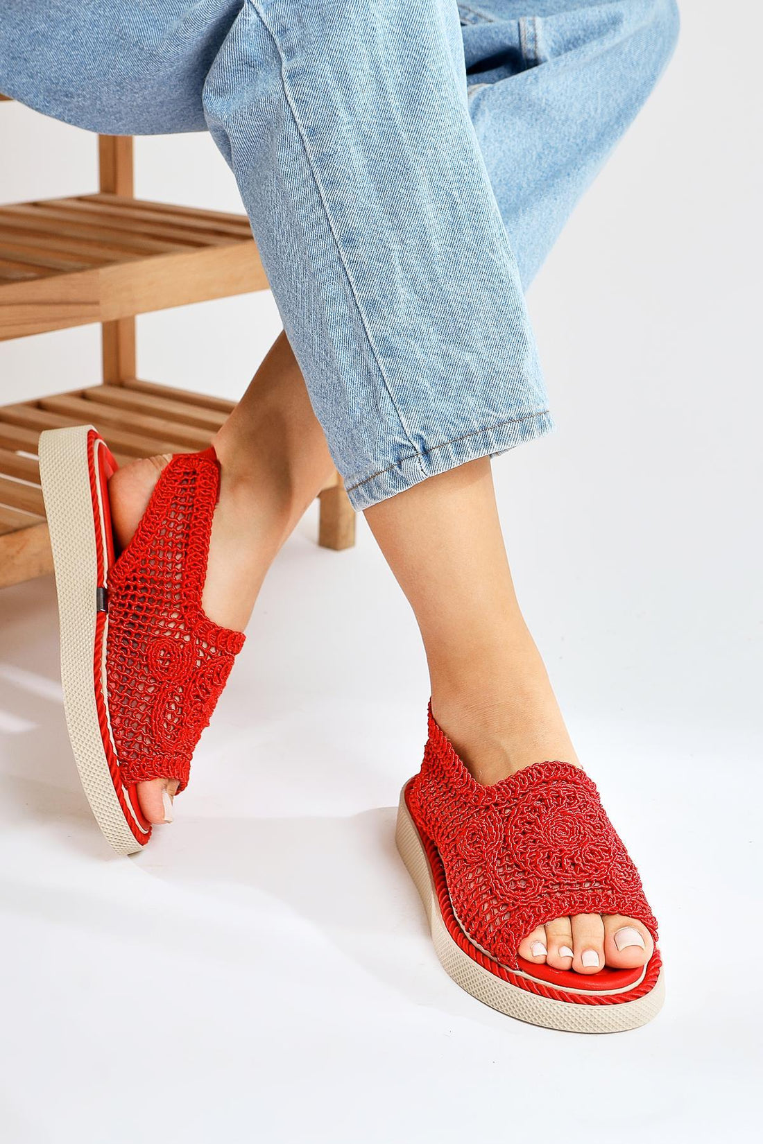 Anisa Kırmızı Çapraz Bantlı Parmak Arası Tokalı Kadın Sandalet
