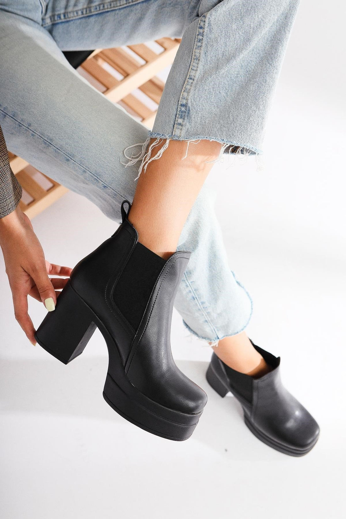 Dorsaf Siyah Oval Burunlu Lastikli Topuklu Bot