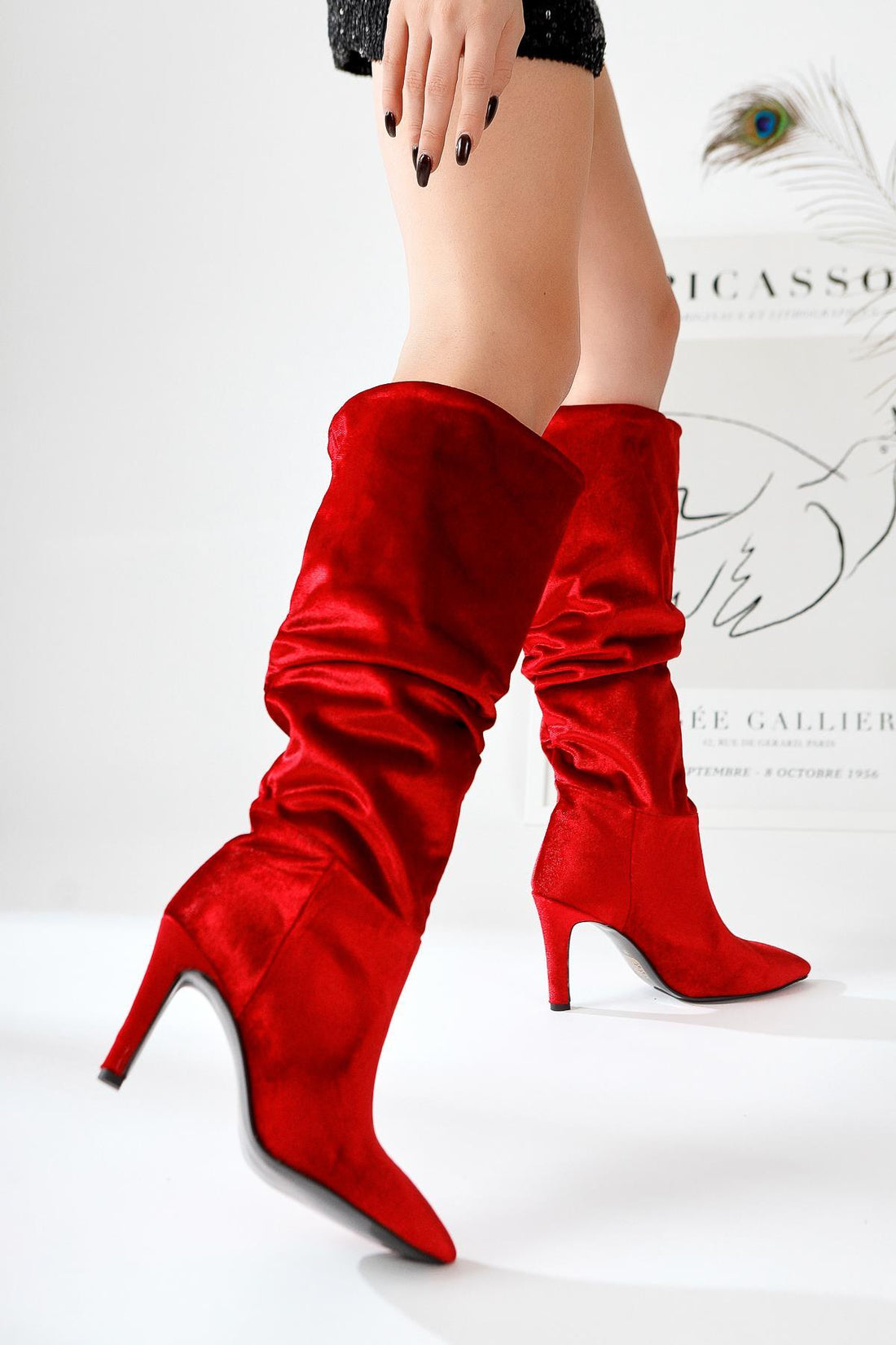 Rimaz Kırmızı Kadife Körüklü Uzun Sivri Topuklu Çizme