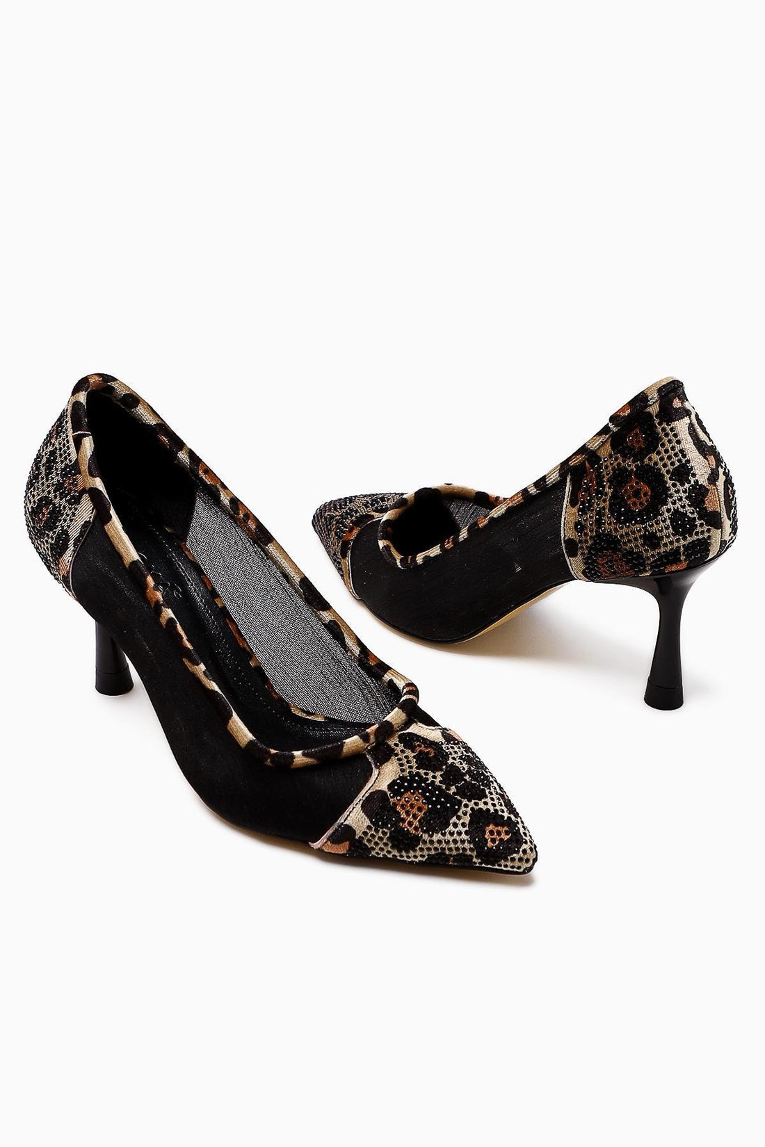 Kalliopi Siyah Sivri Burunlu Leopar - Taş Detaylı Kadın Topuklu Ayakkabı