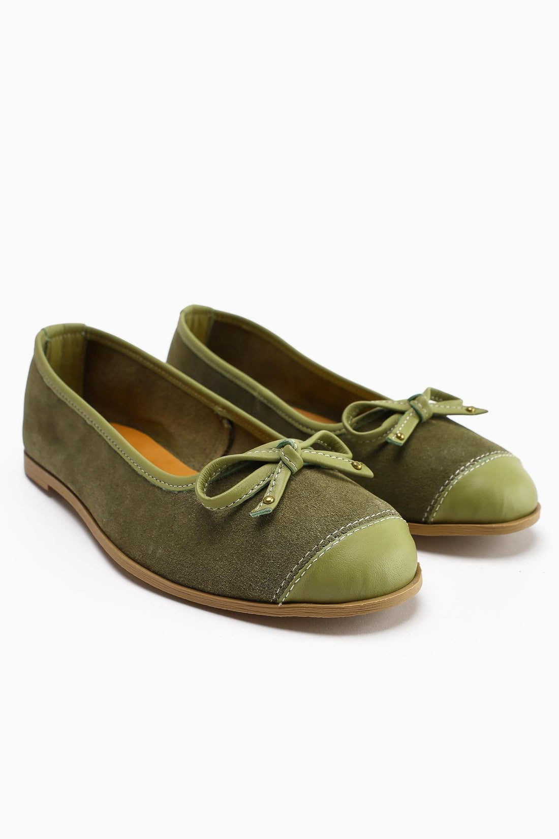Hakiki Deri Alfreda Haki Süet Deri Detaylı Fiyonklu Kadın Babet
