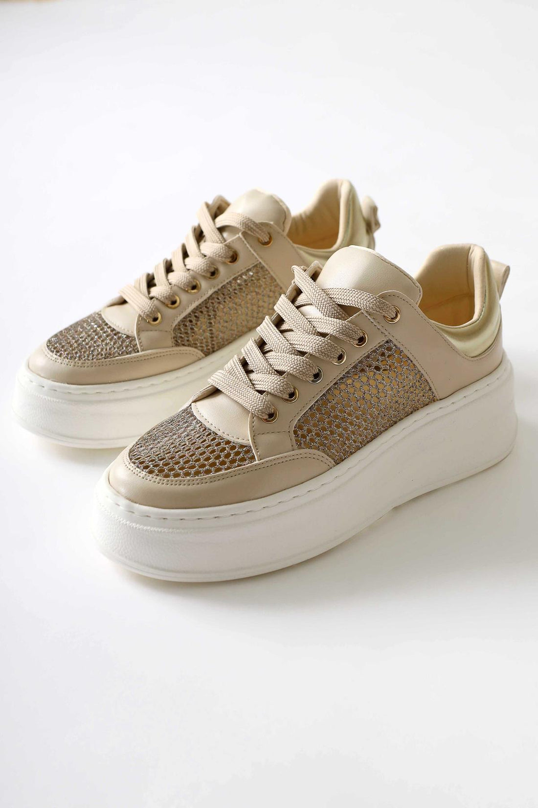 Tram Bej Kalın Tabanlı Taş Detaylı Bağcıklı Sneakers