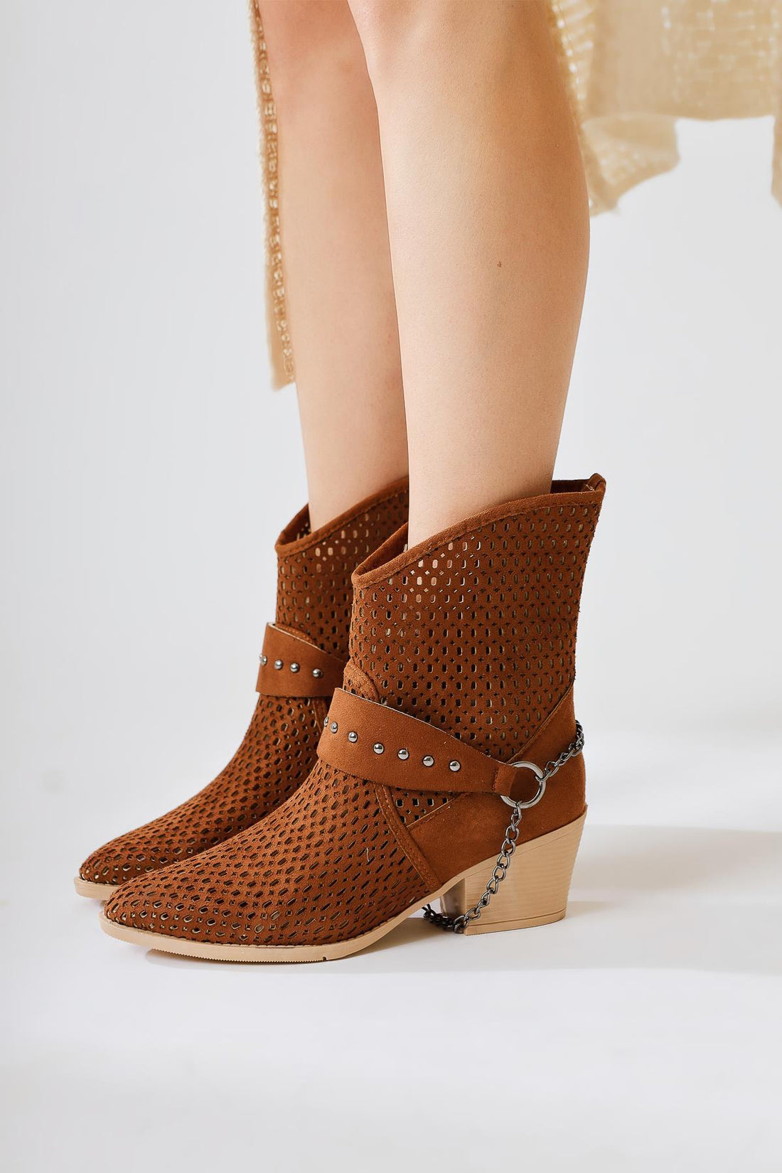 Olinda Taba Süet Lazer Kesim Sivri Burunlu Zincir Detaylı Yazlık Western Bot