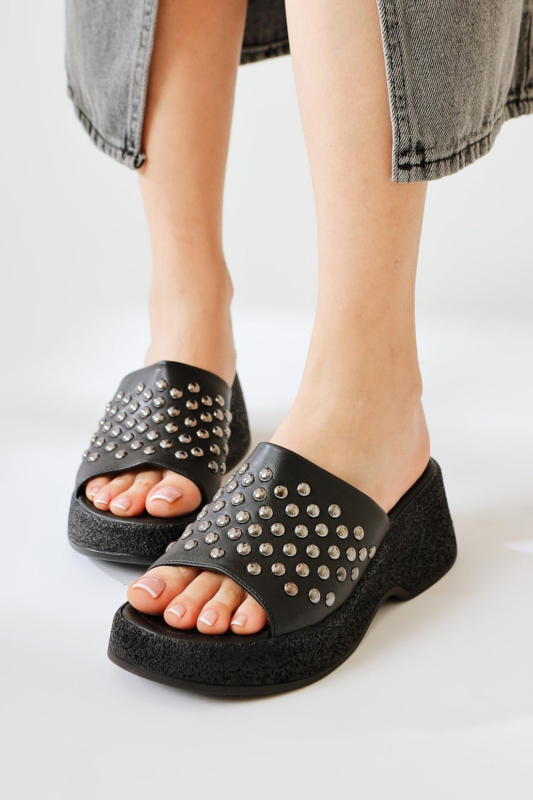 Fenthe Siyah Zımba Detaylı Kalın Tabanlı Terlik