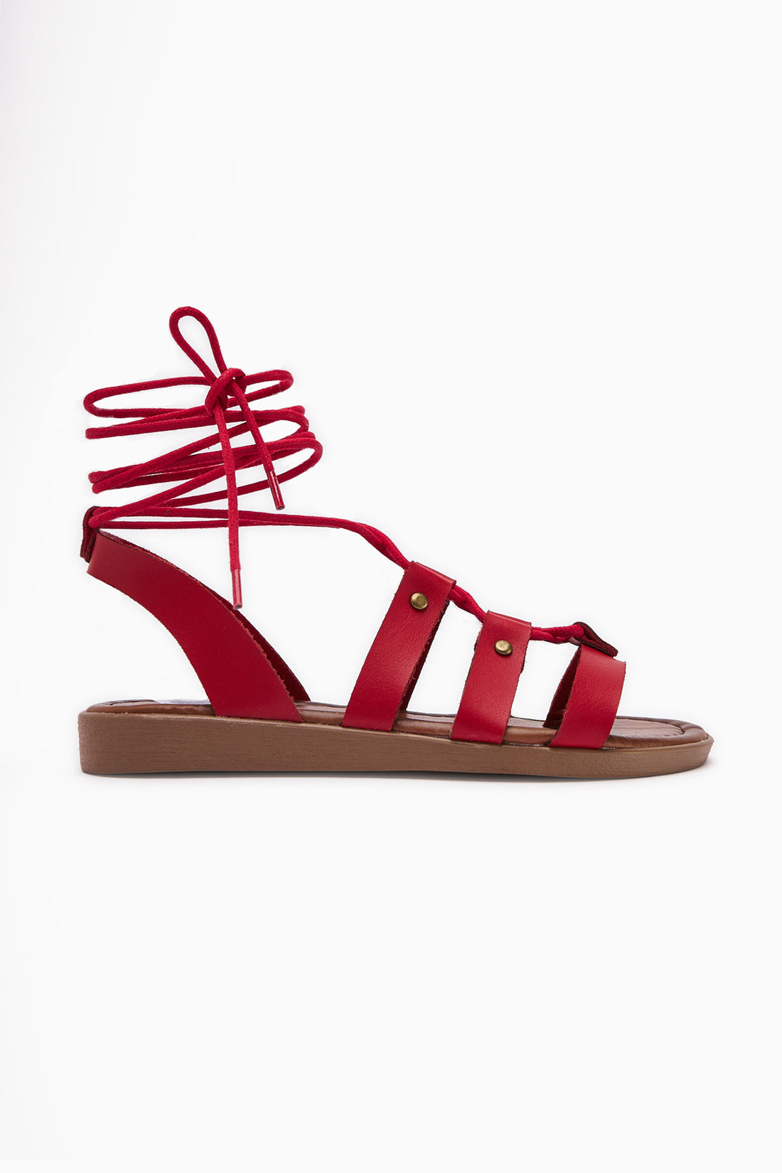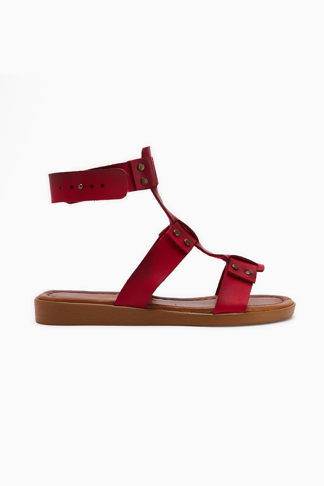 Hakiki Deri Ruut Kırmızı Perçin Detaylı Bilekten Bağlamalı Sandalet