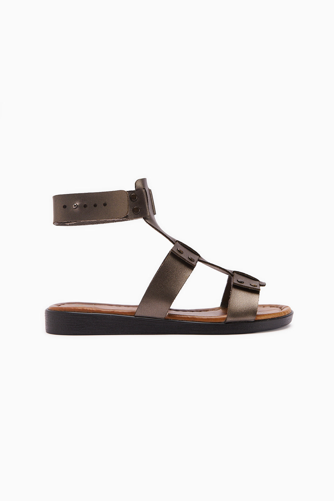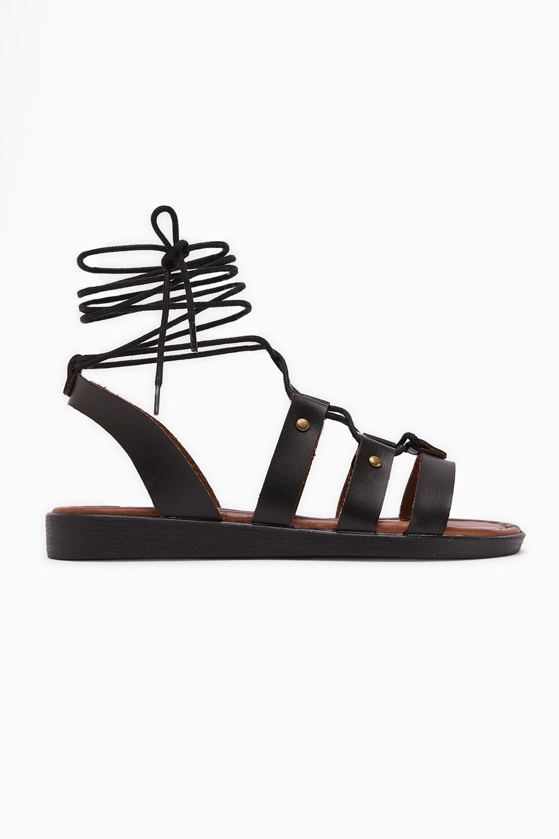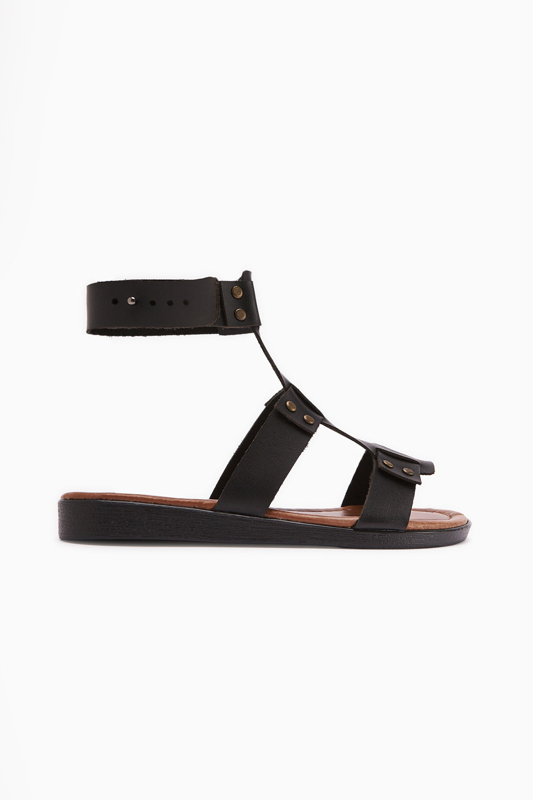 Hakiki Deri Ruut Siyah Perçin Detaylı Bilekten Bağlamalı Sandalet