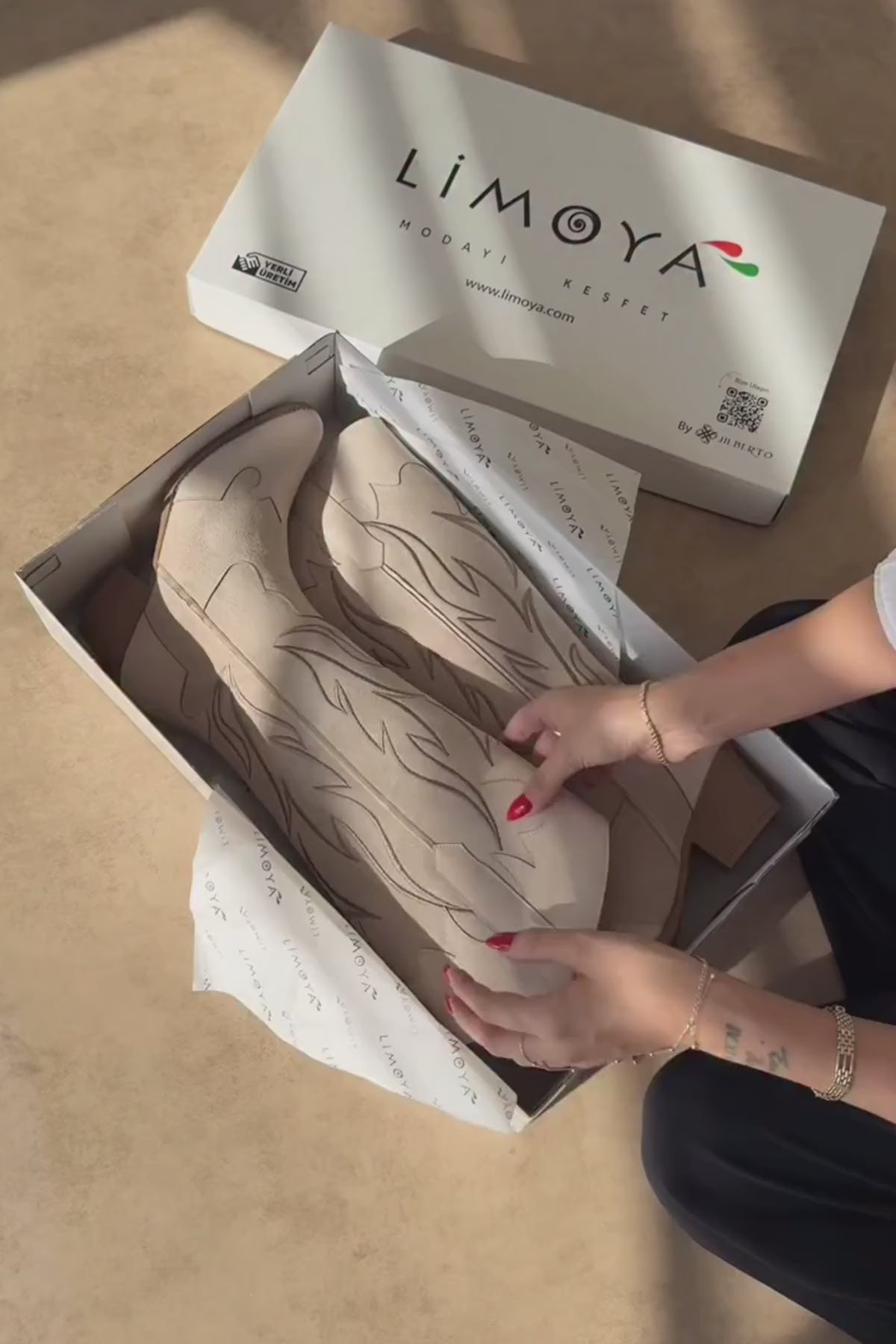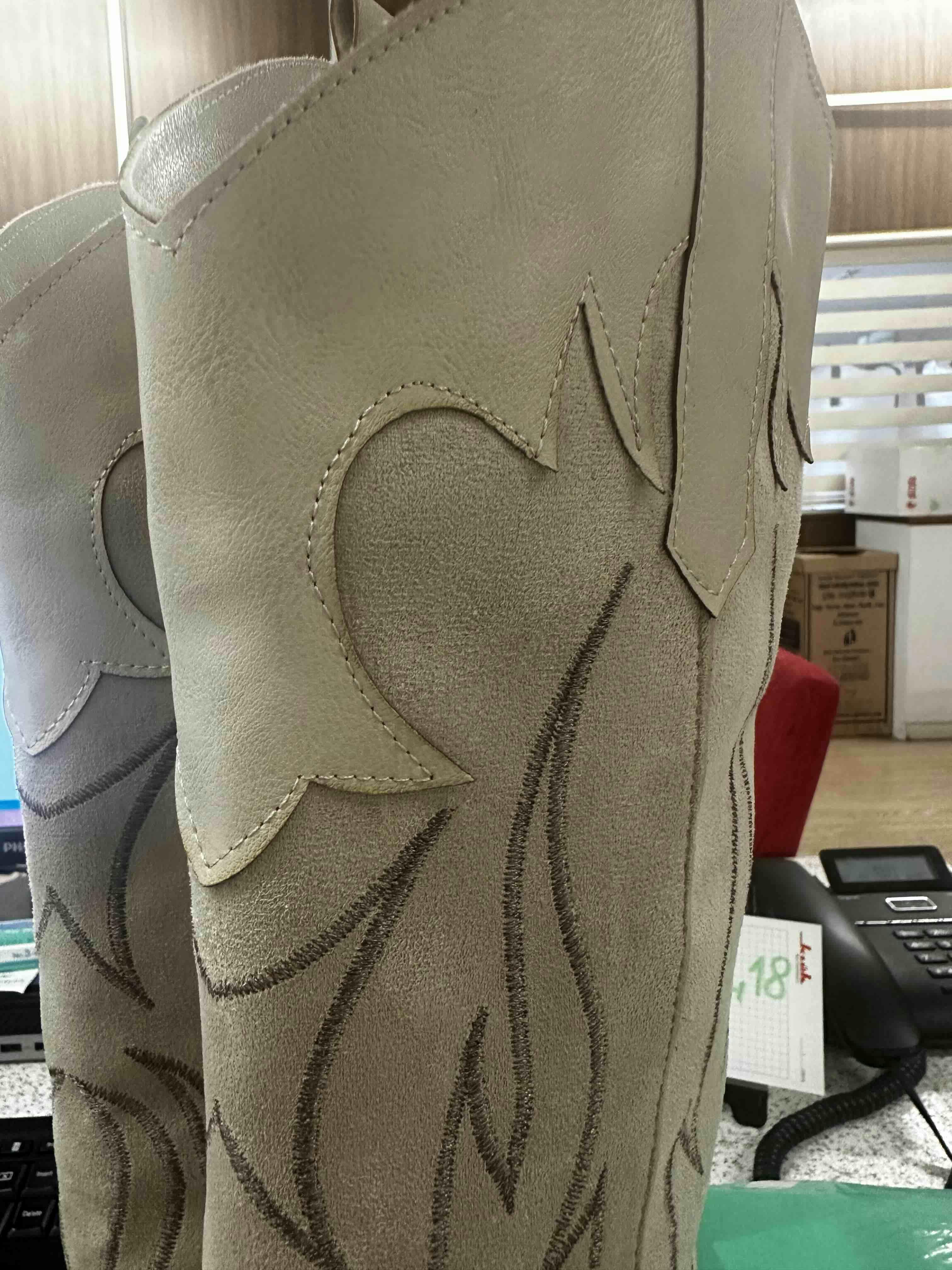 Bahar Bej Süet Nakışlı Deri Detaylı Topuklu Western Çizme