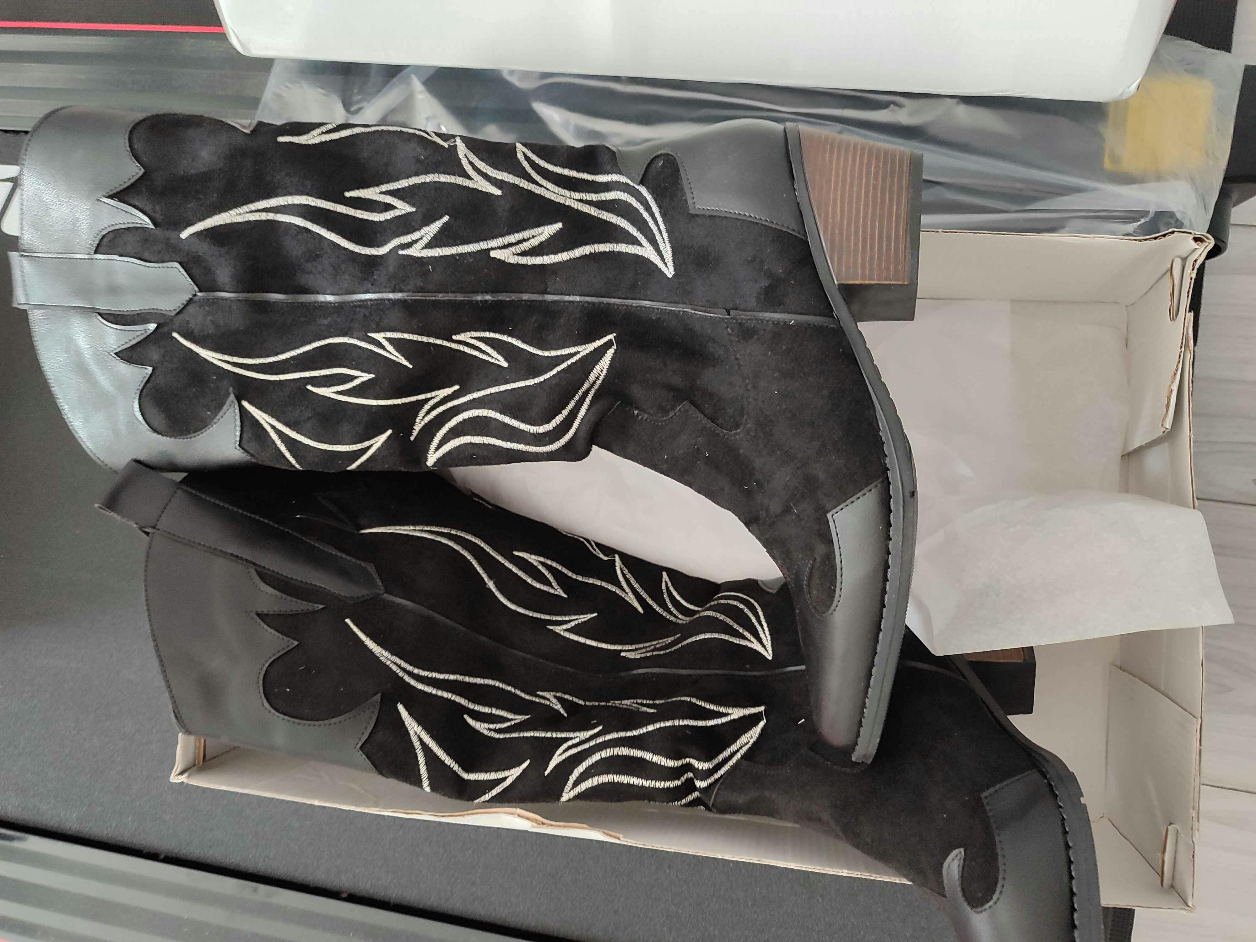 Bahar Siyah Süet Nakışlı Deri Detaylı Topuklu Western Çizme