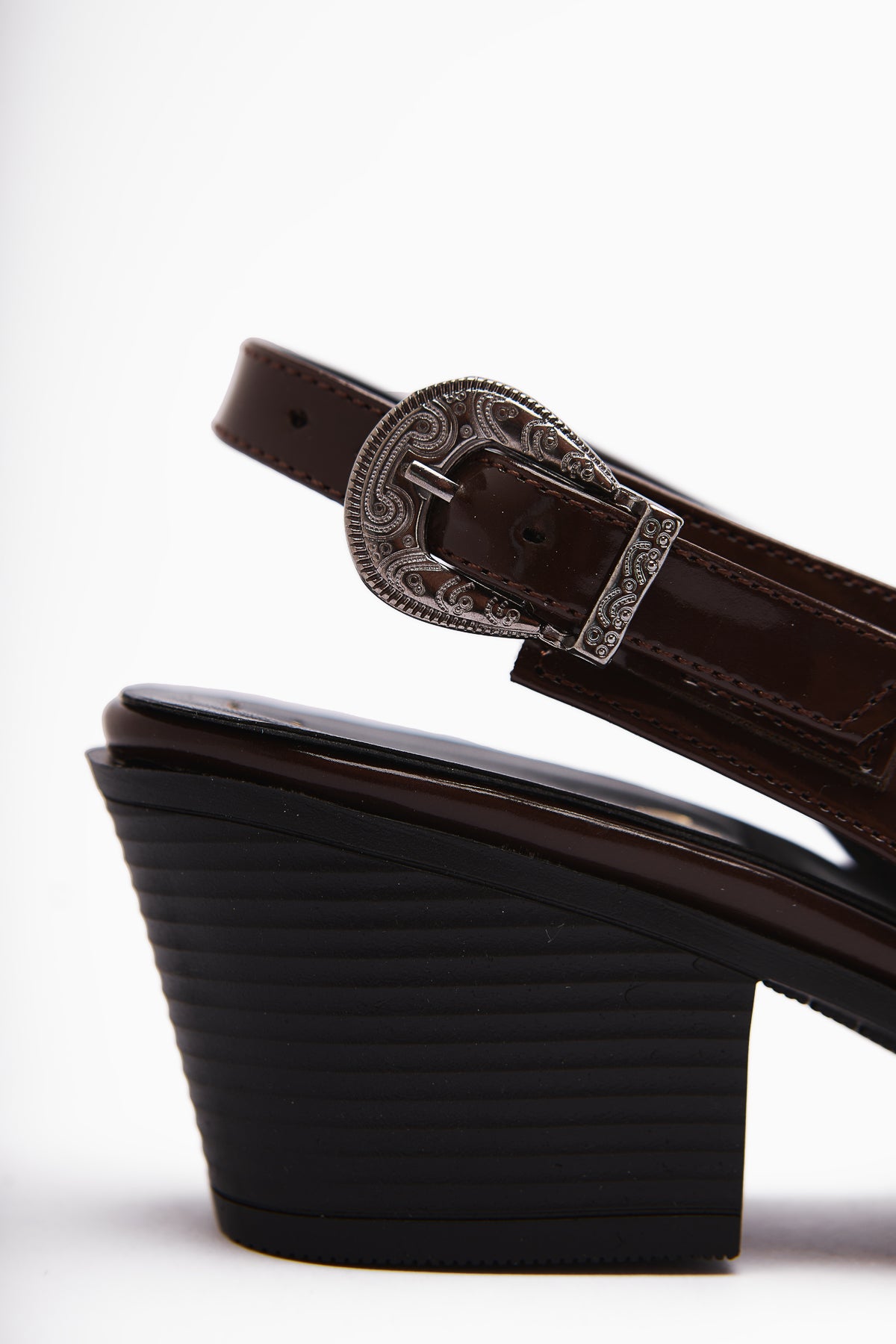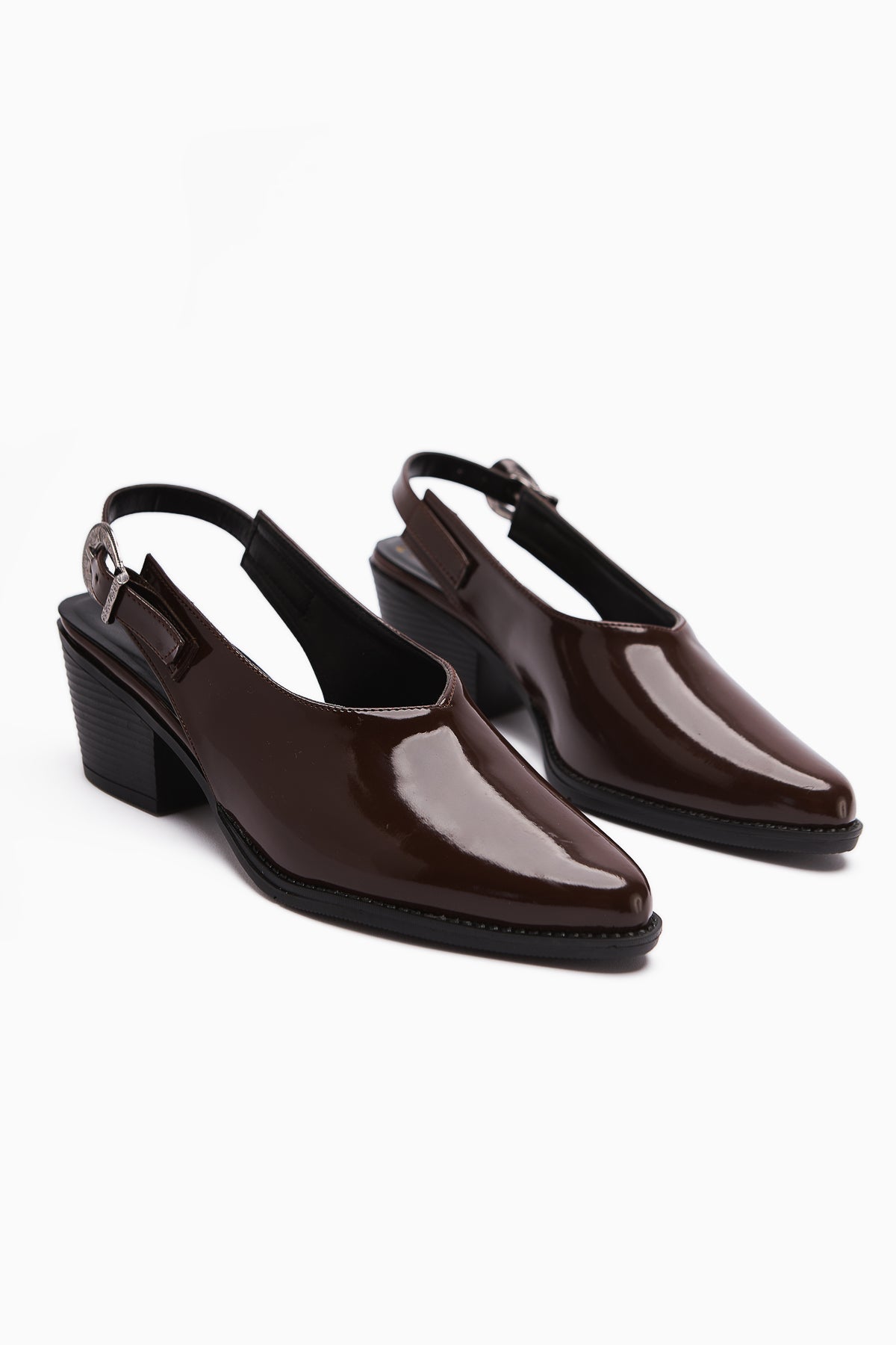 Emira Kahve Rugan Sivri Burunlu Önü Kapalı Kadın Sandalet