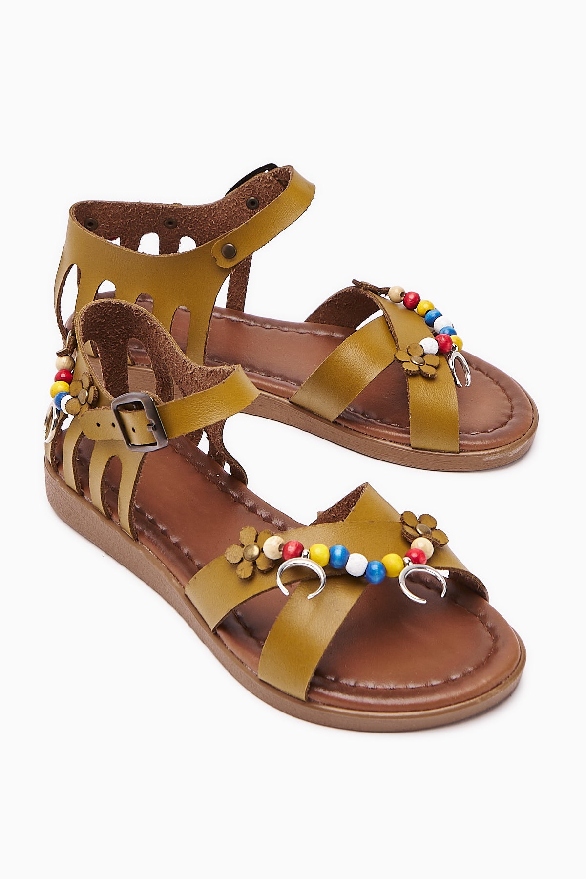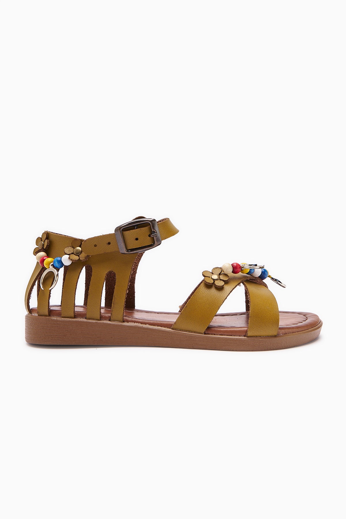 Hakiki Deri Alize Hardal Boncuk ve Yaprak Detaylı Sandalet