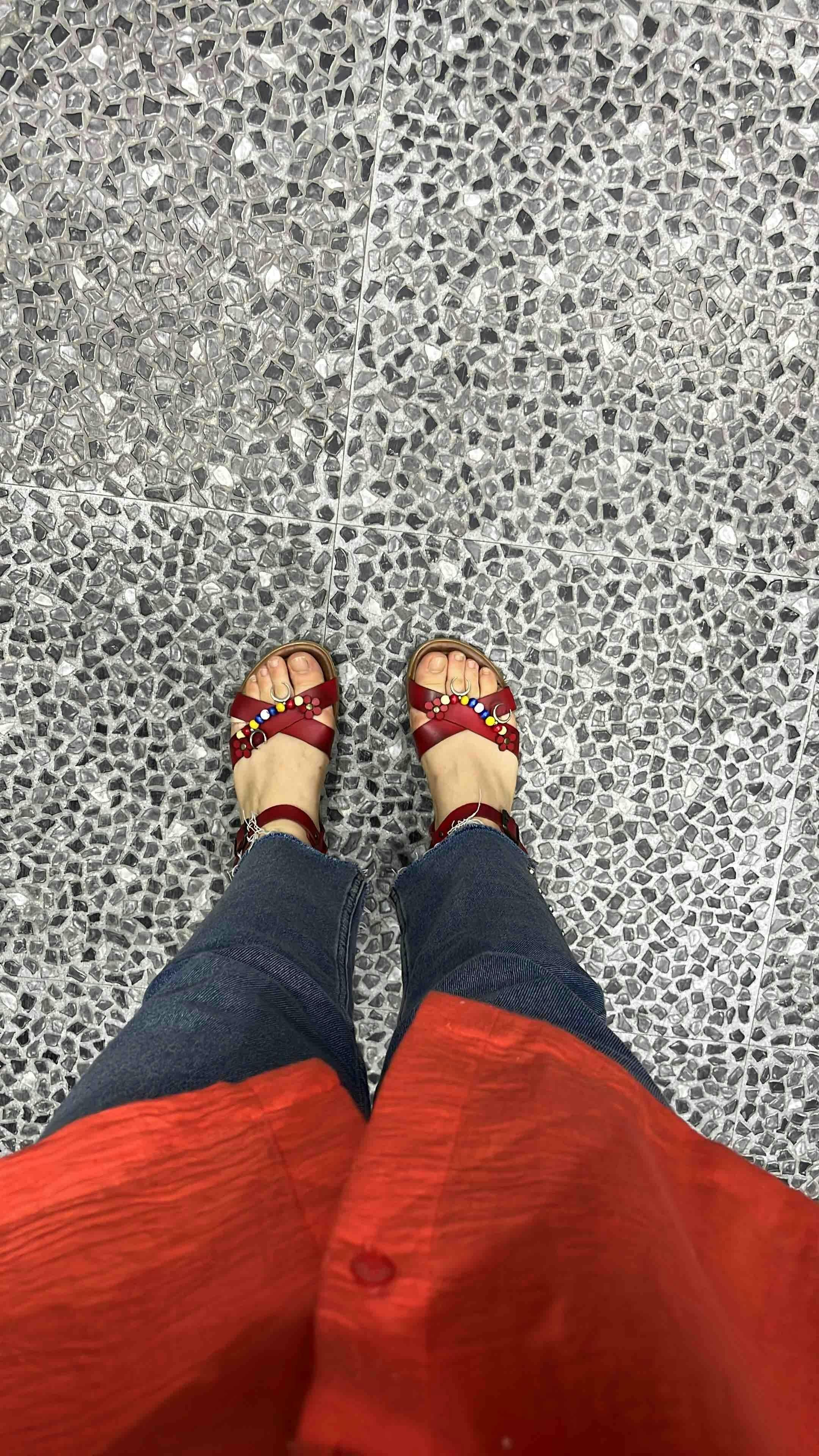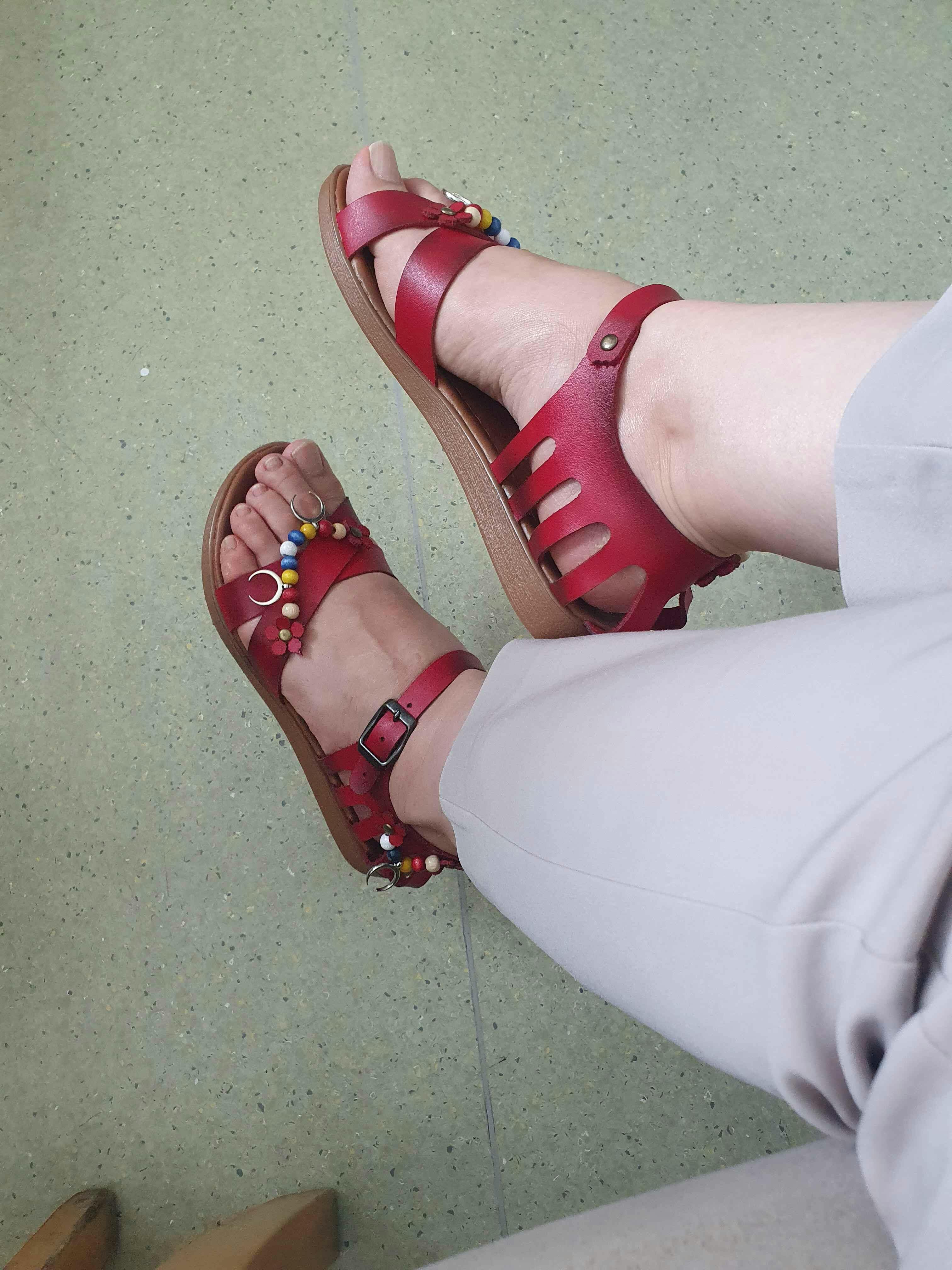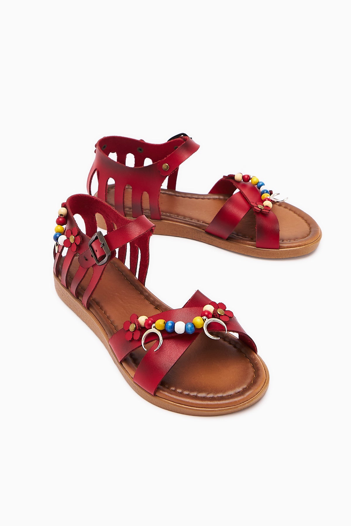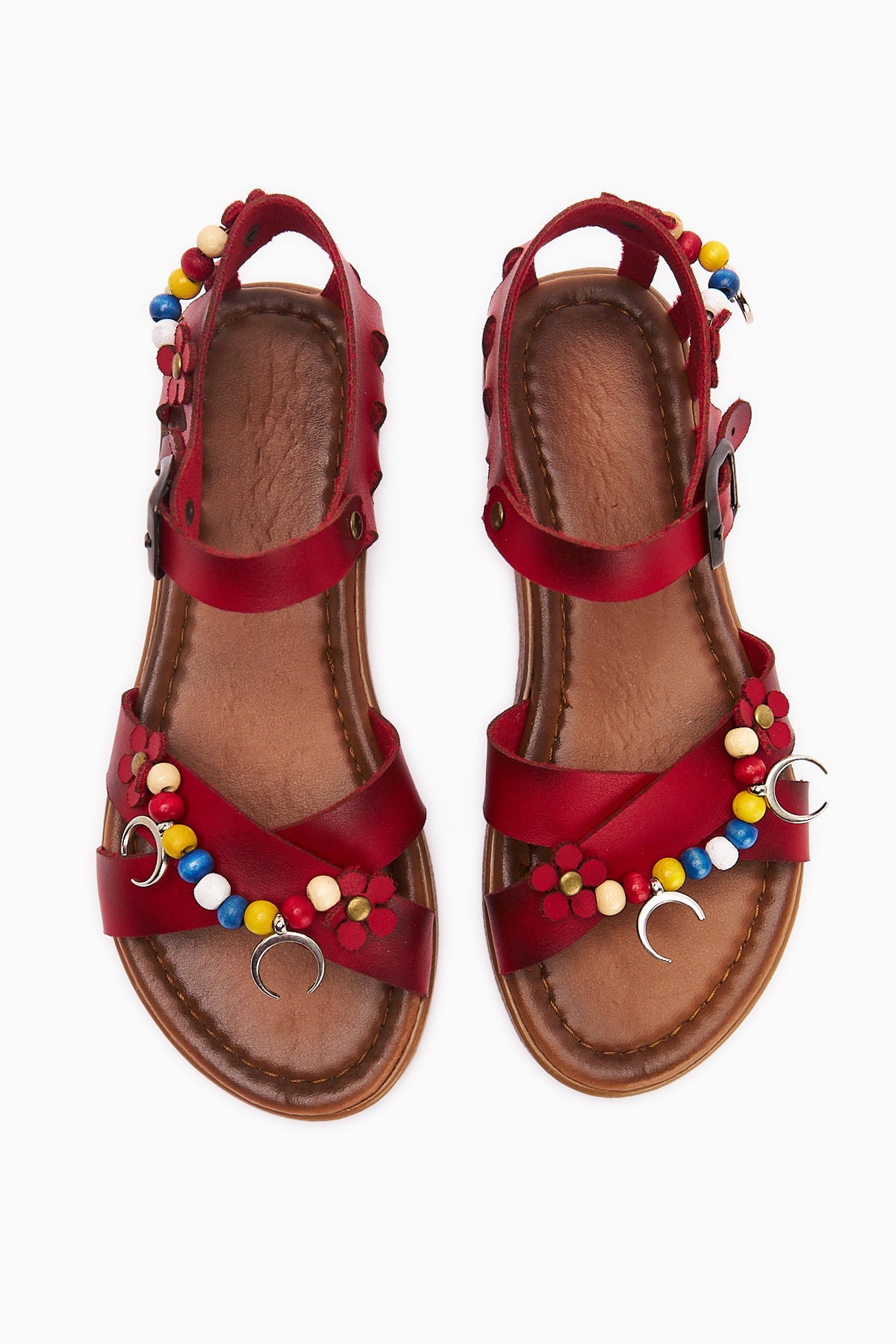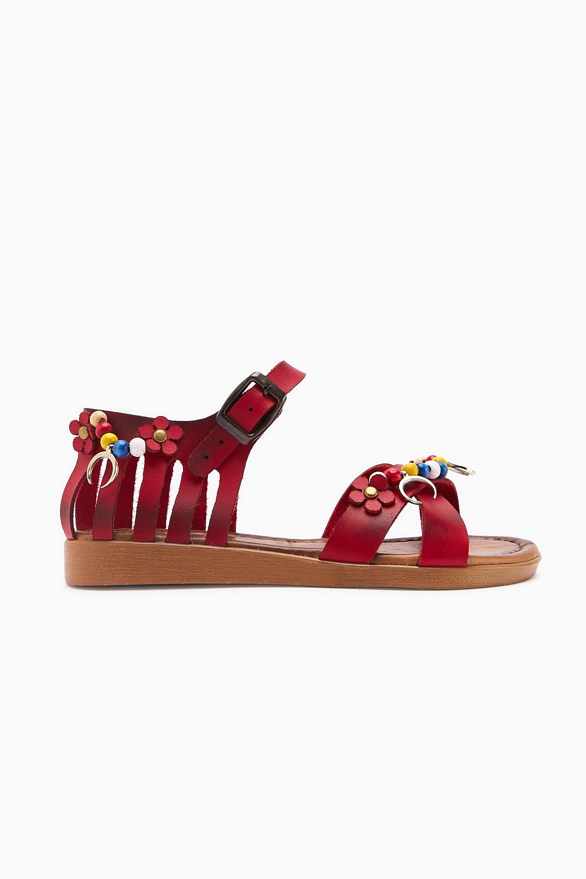 Hakiki Deri Alize Kırmızı Boncuk ve Yaprak Detaylı Sandalet