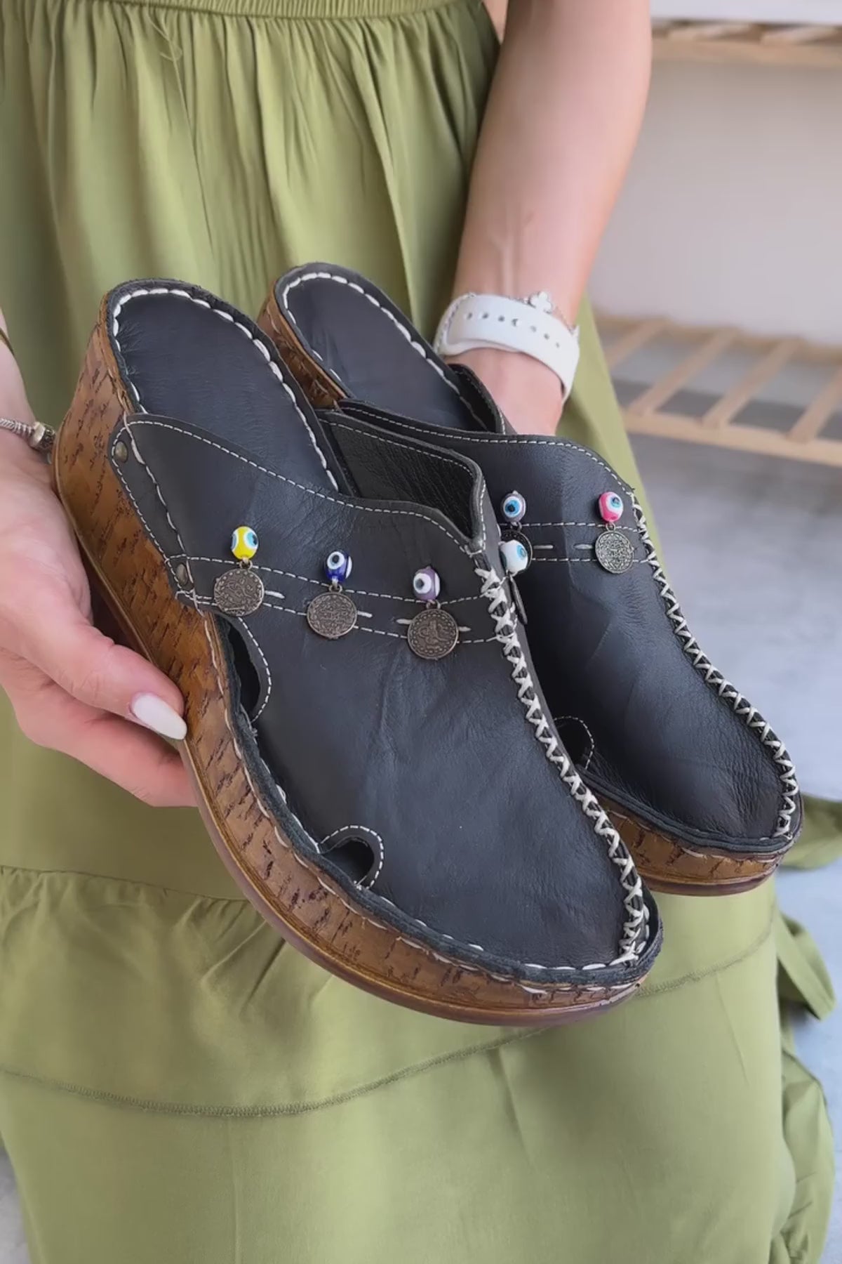 Hakiki Deri Annika Saks Antik Detaylı Dolgu Sabo Terlik
