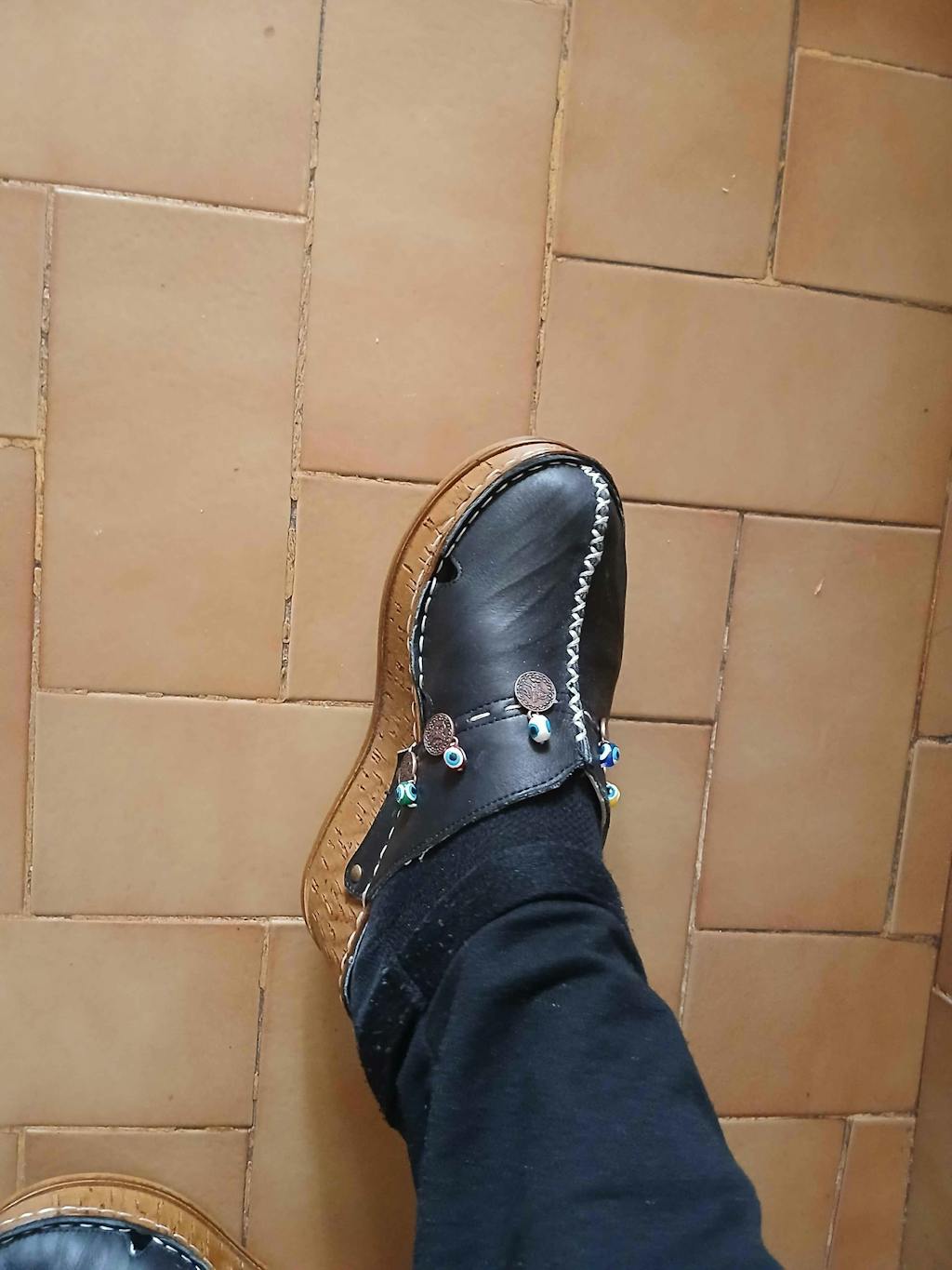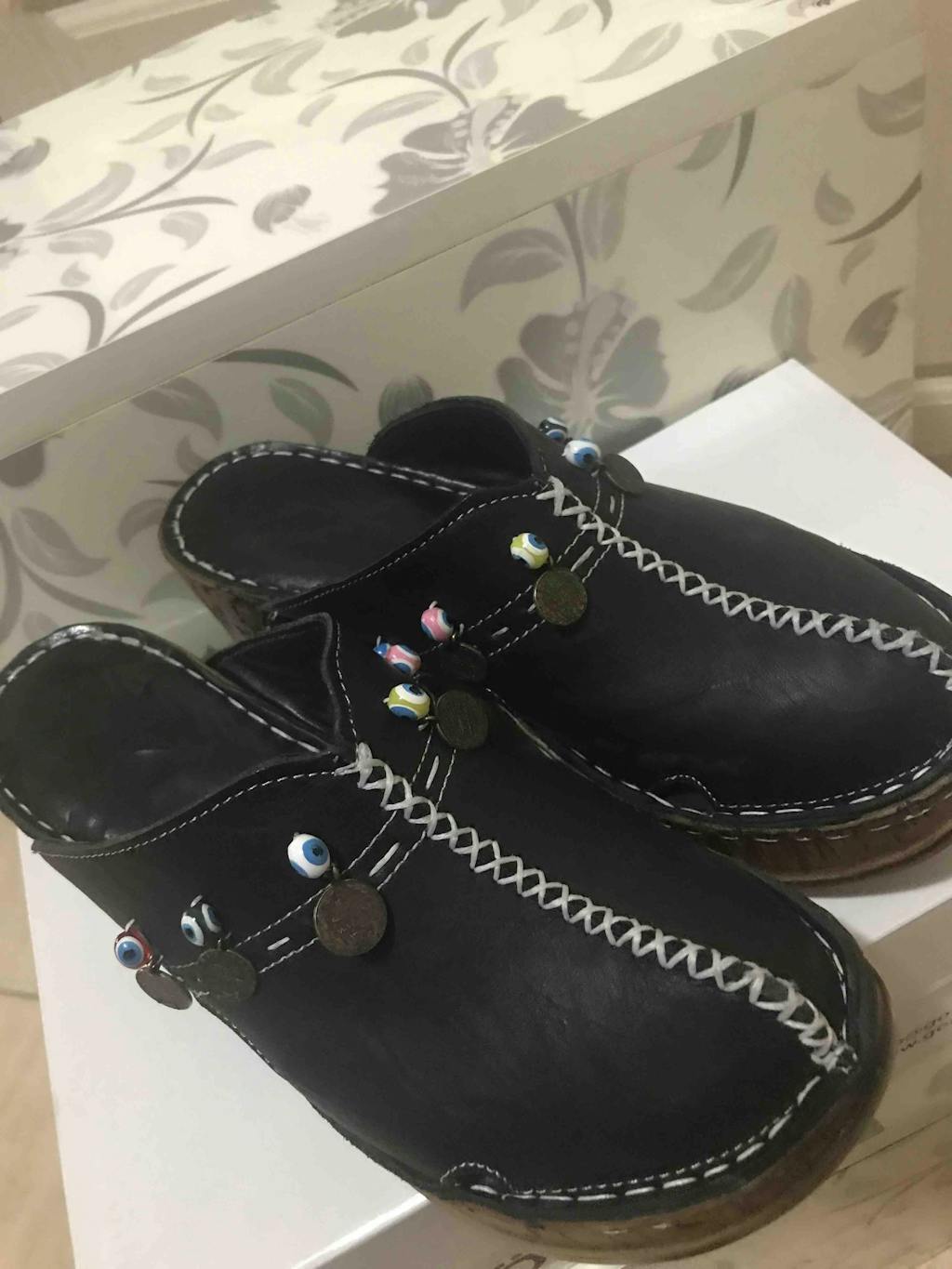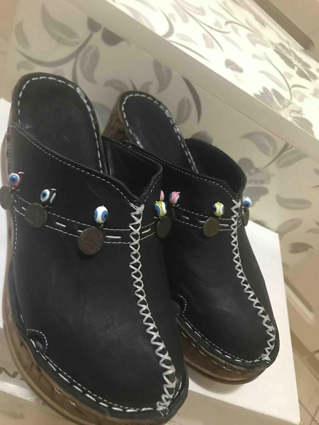 Hakiki Deri Annika Siyah Antik Detaylı Dolgu Sabo Terlik
