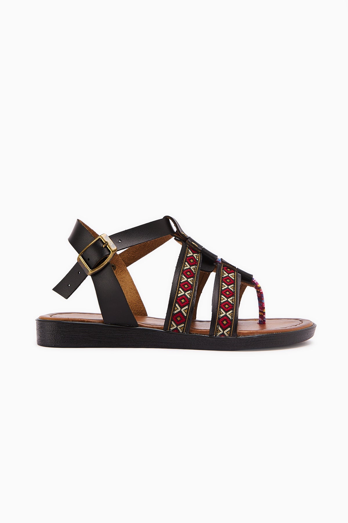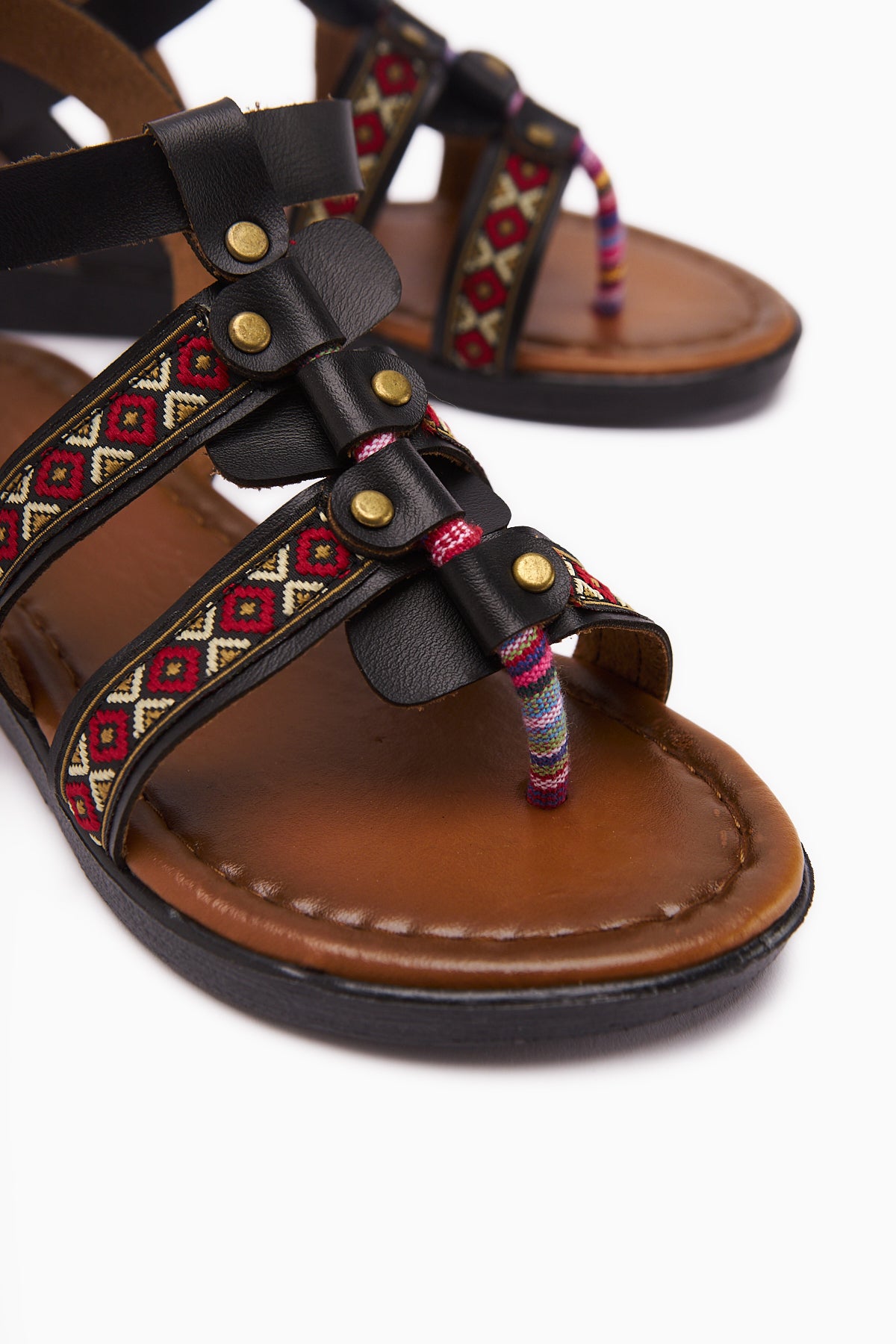 Hakiki Deri Gabrielle Siyah Parmak Arası Ayarlanabilir Etnik Desenli Düz Sandalet