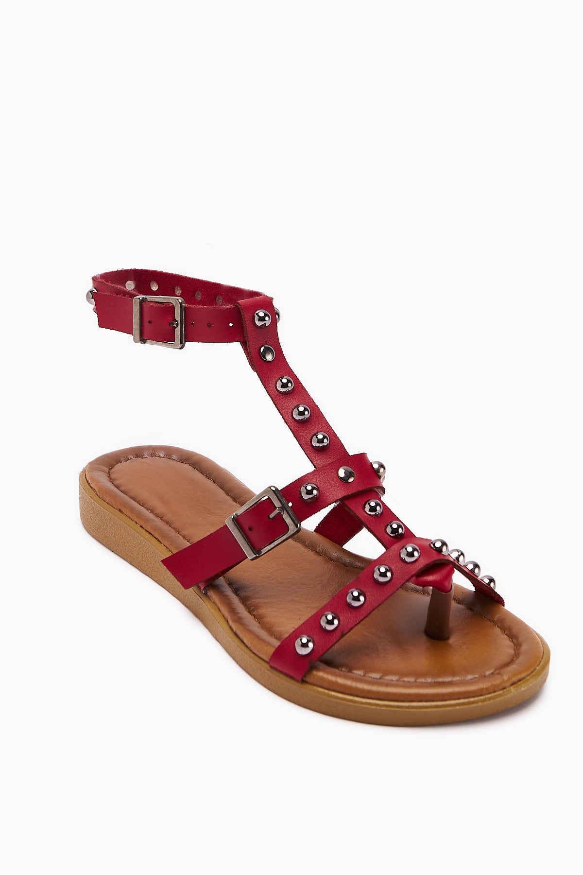 Hakiki Deri Hivin Kırmızı Metal Boncuk Detaylı Sandalet