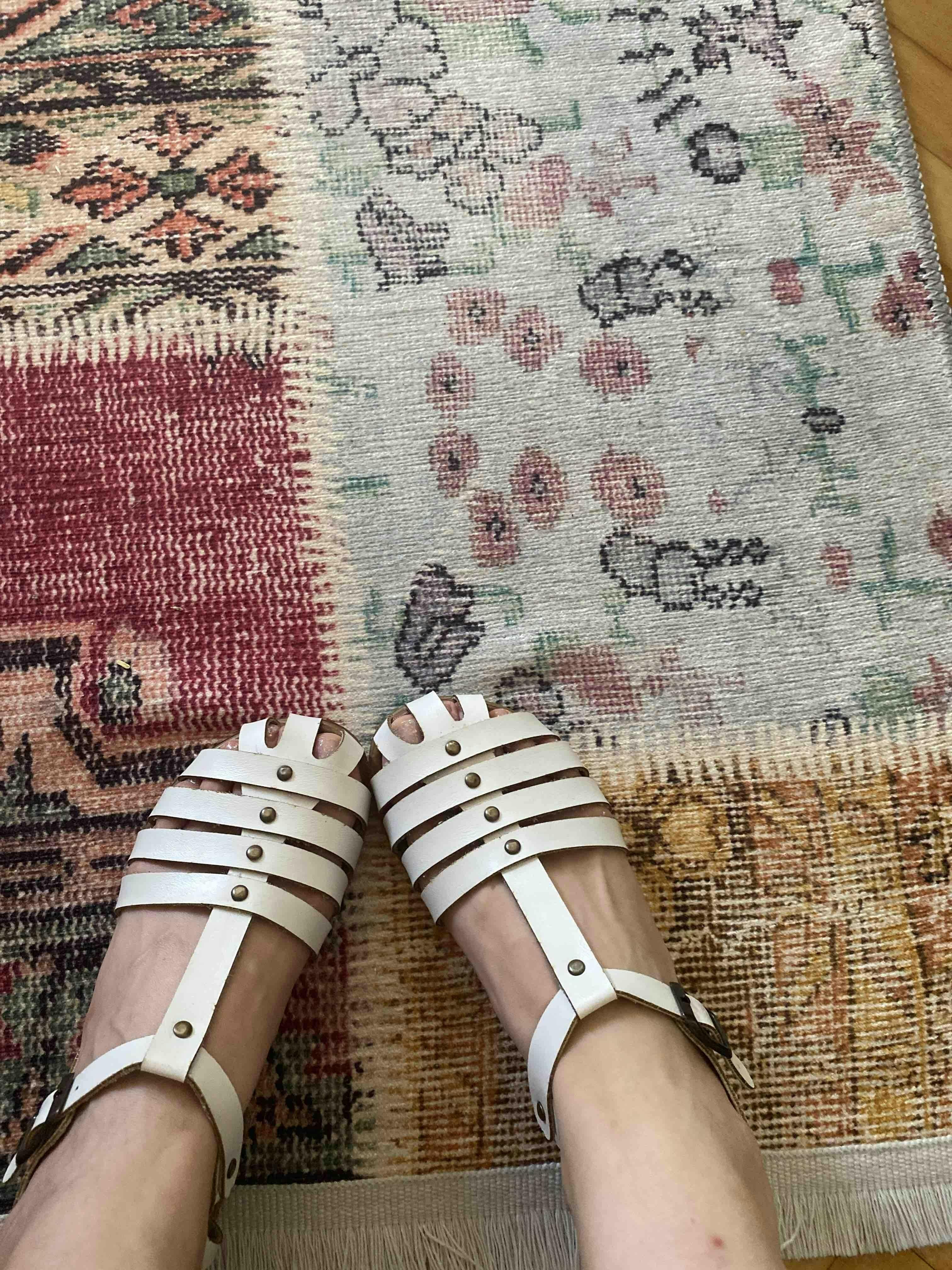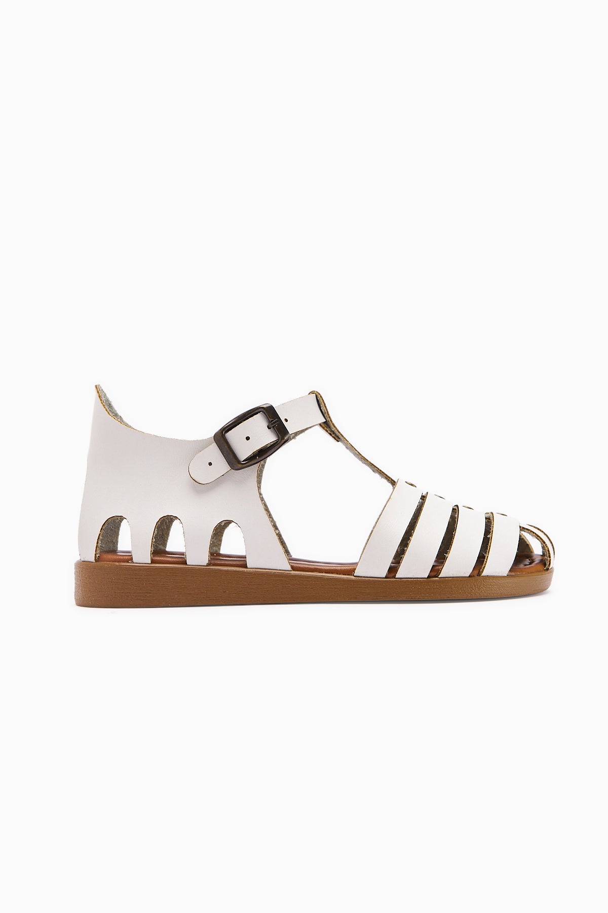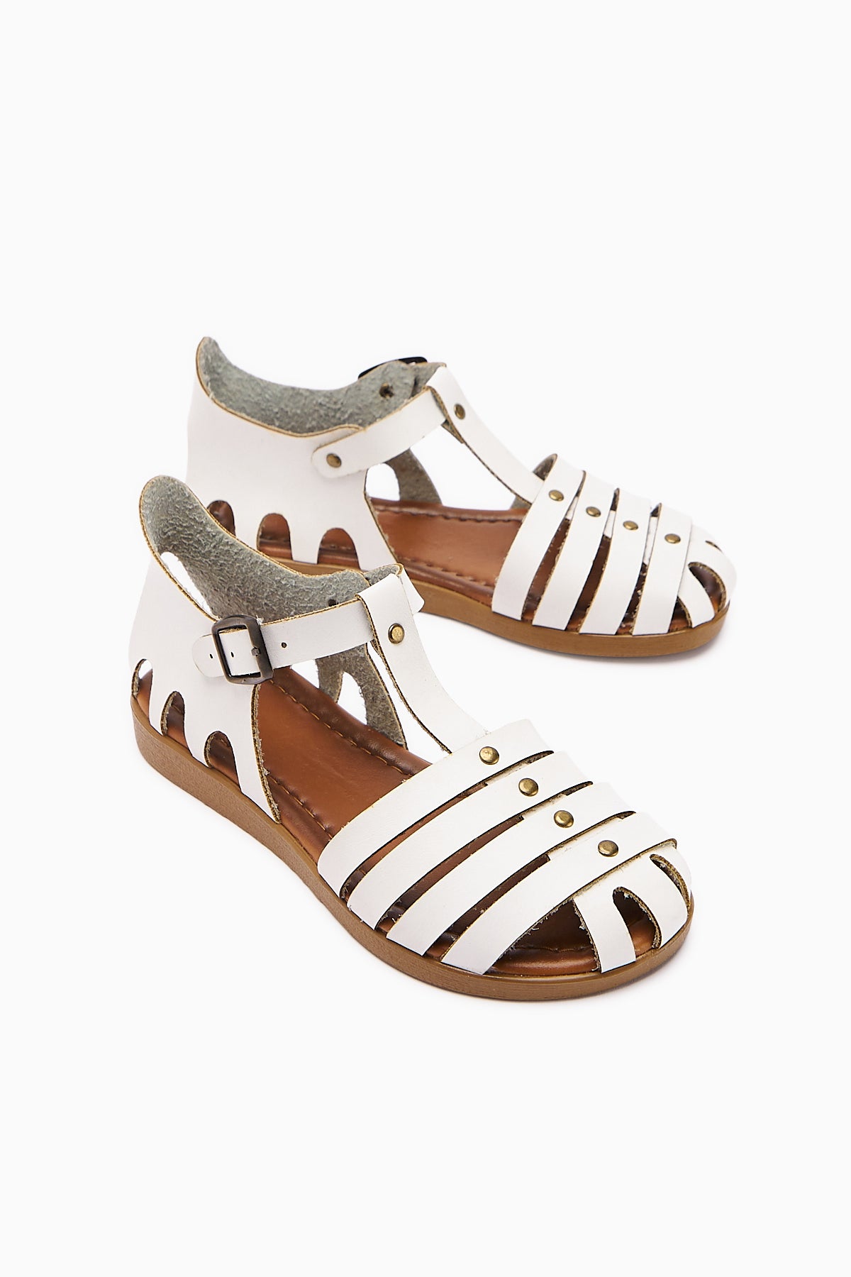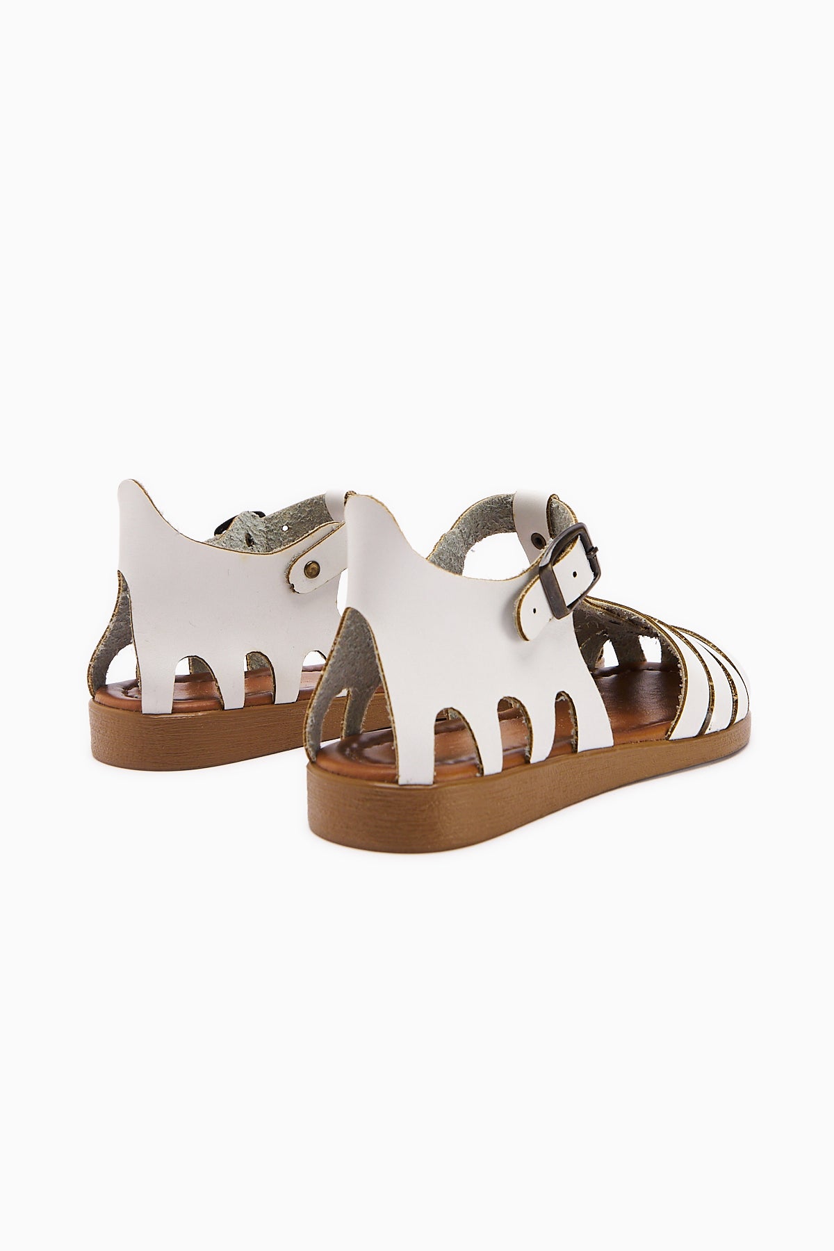 Hakiki Deri Tori Beyaz Dört Bantlı Ayarlanabilir Düz Sandalet