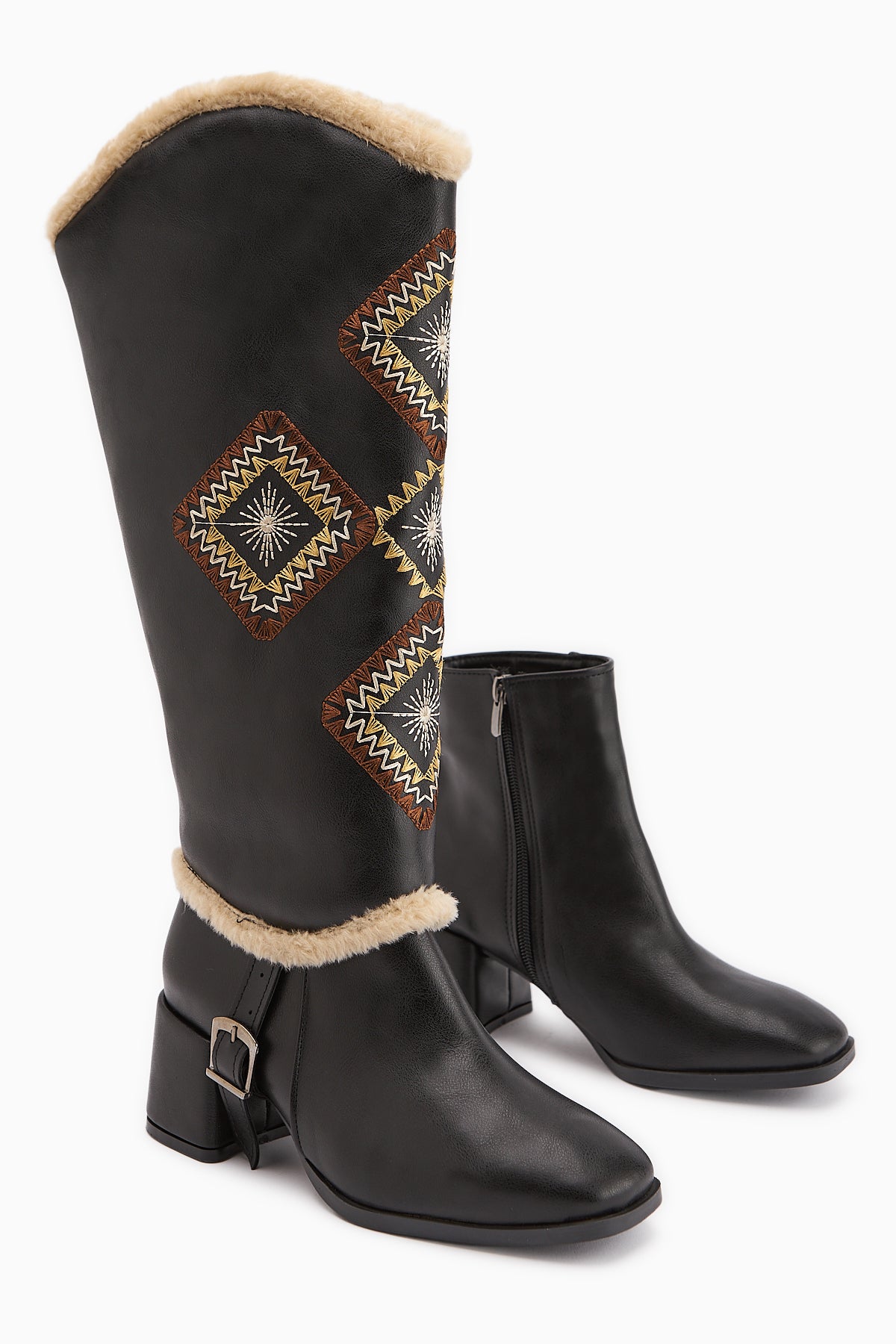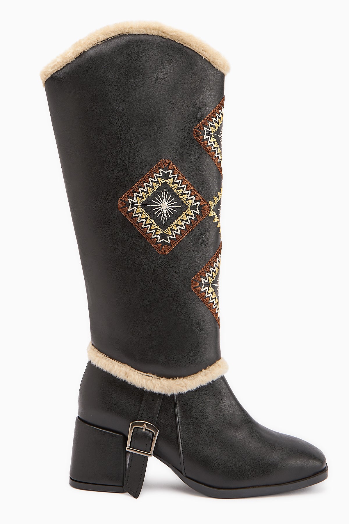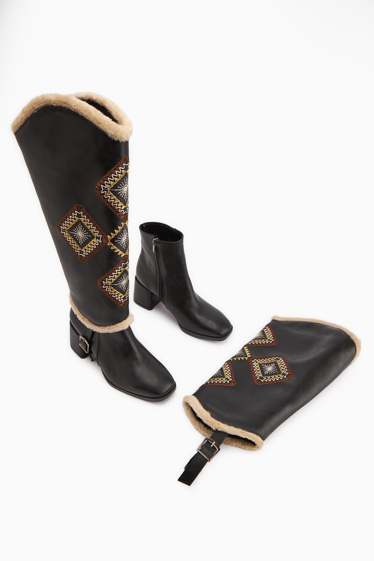 Hilka Siyah Çıkarılabilir Konçlu Etnik Desenli Bot-Çizme