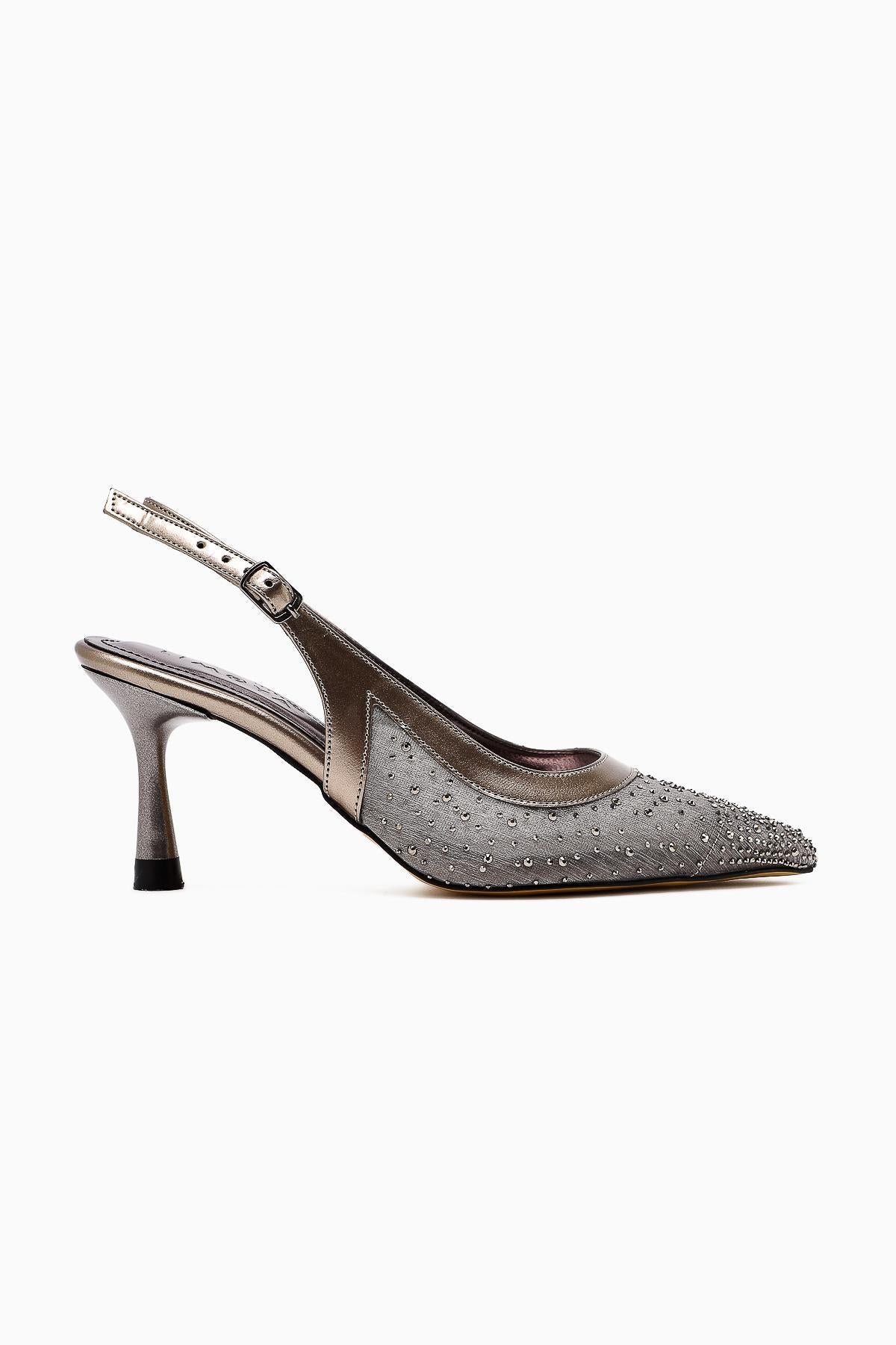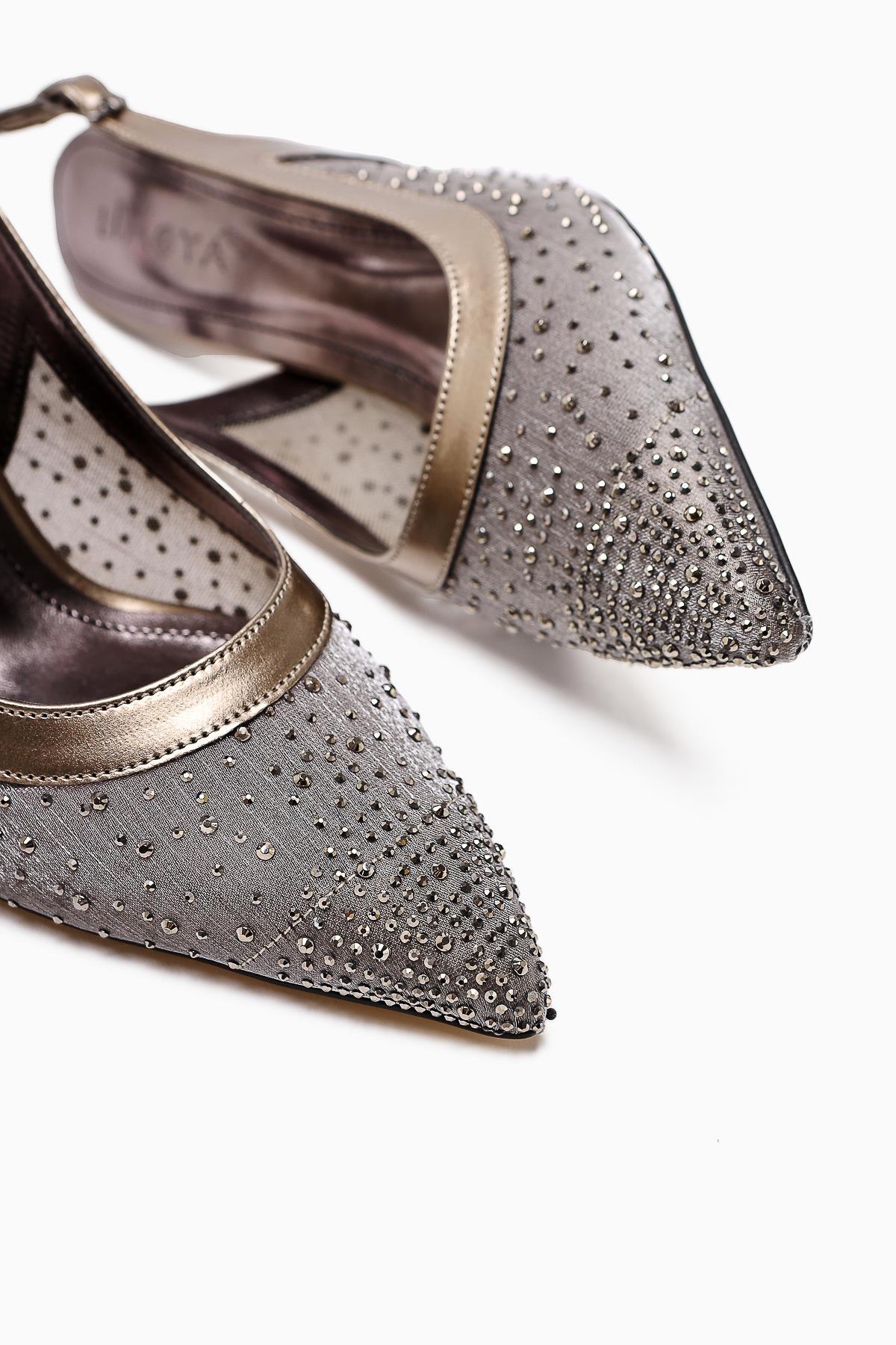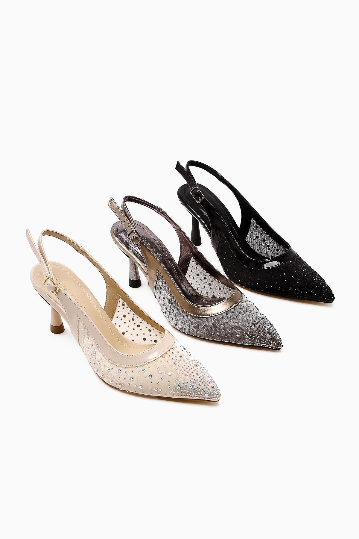 Kally Platin Transparan Kumaş Taş Detaylı Kadın Topuklu Ayakkabı