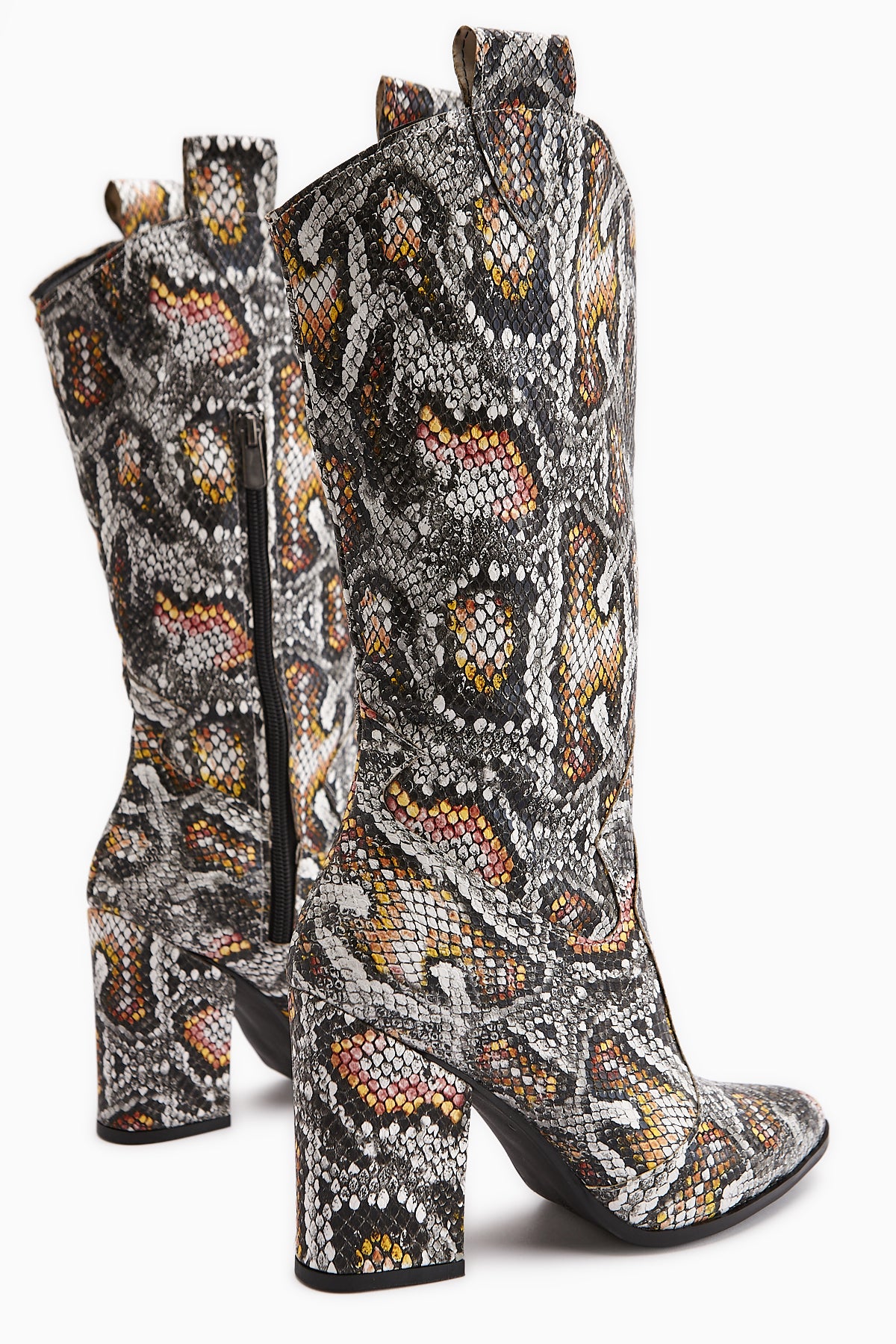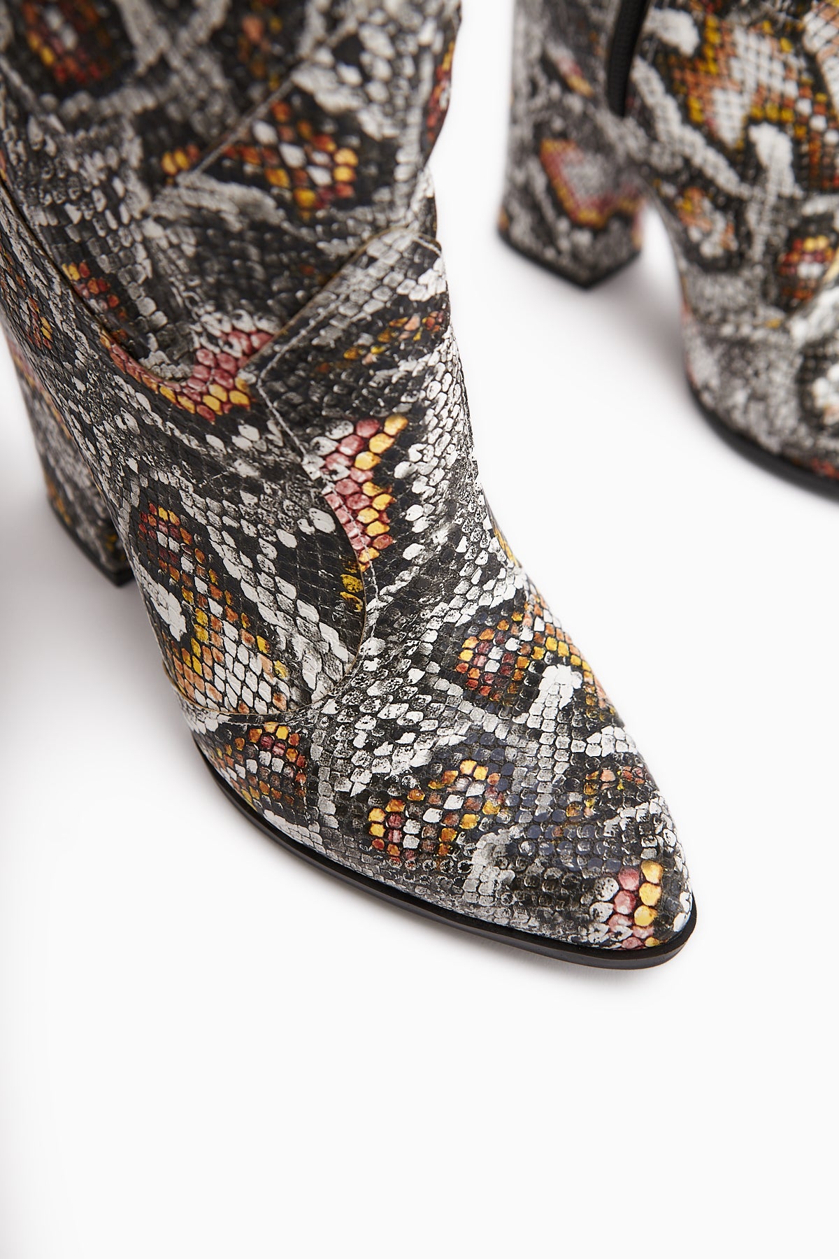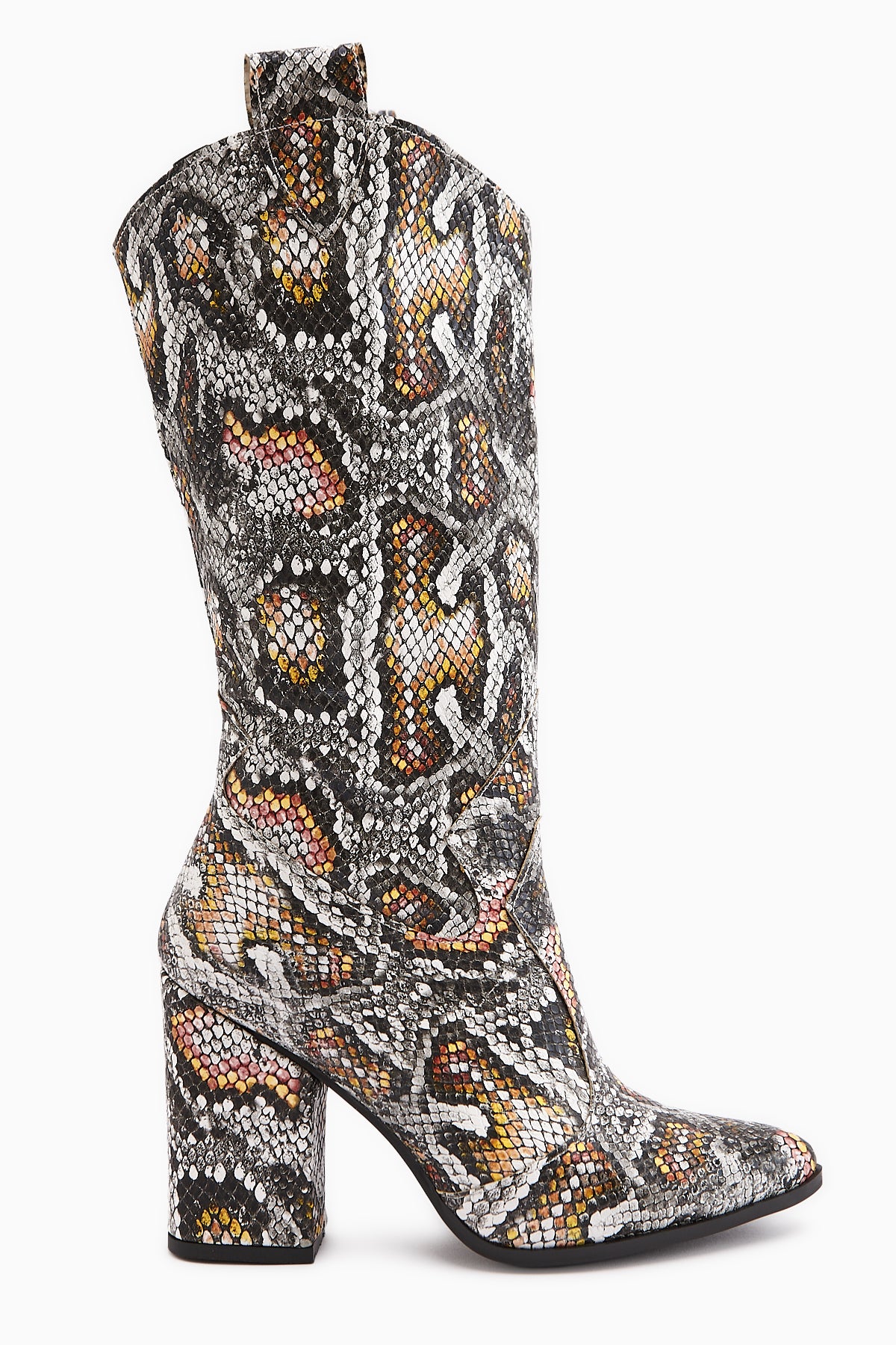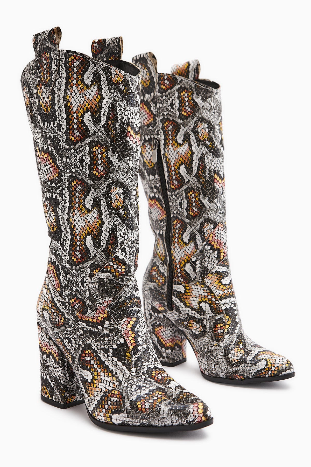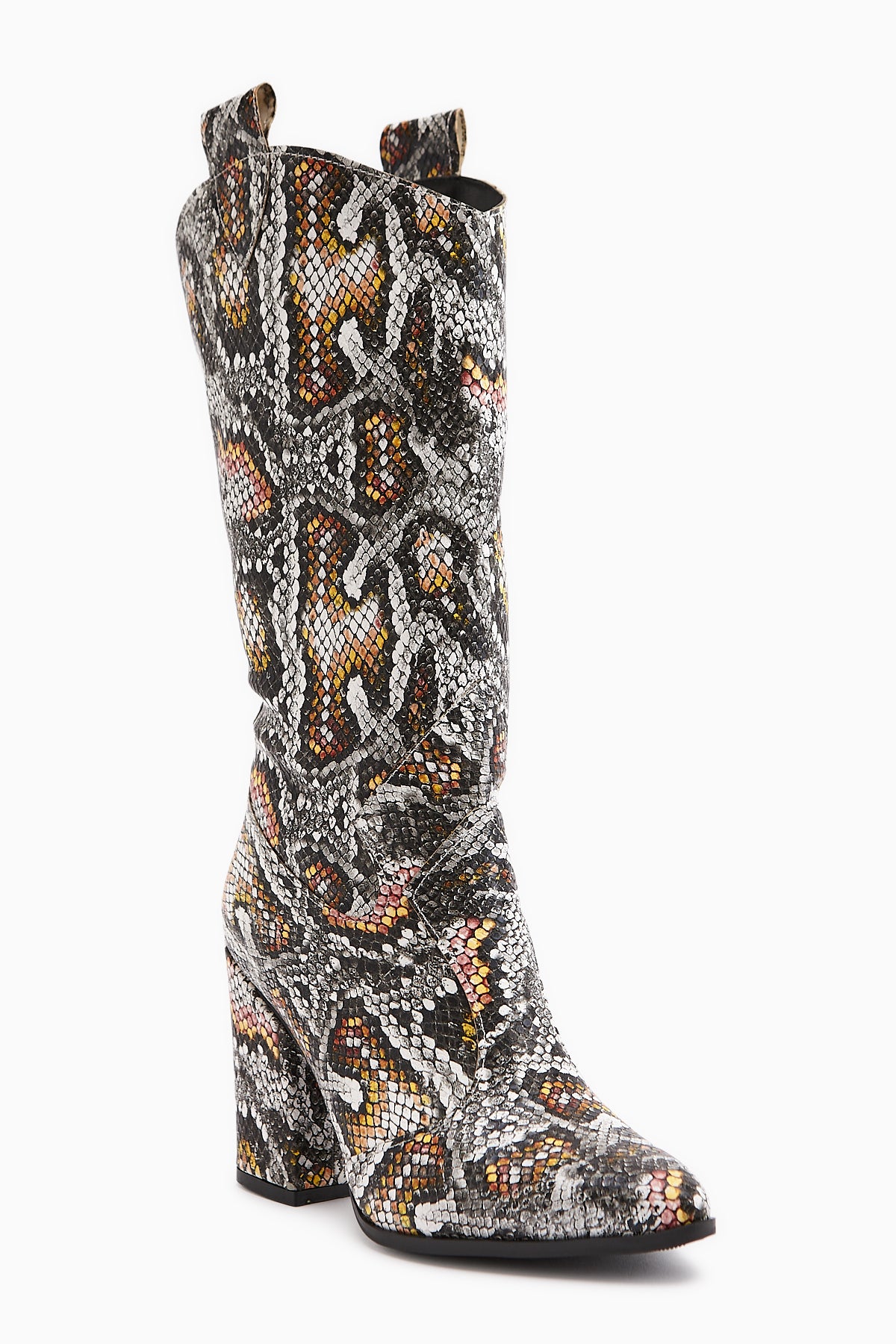 Keri Yılan Desenli Asimetrik Kesim Topuklu Kısa Çizme