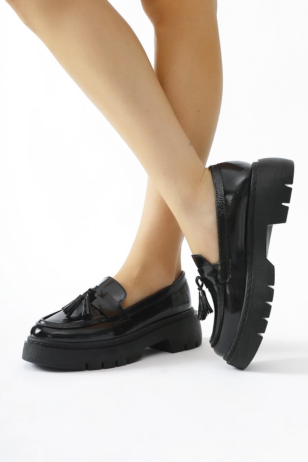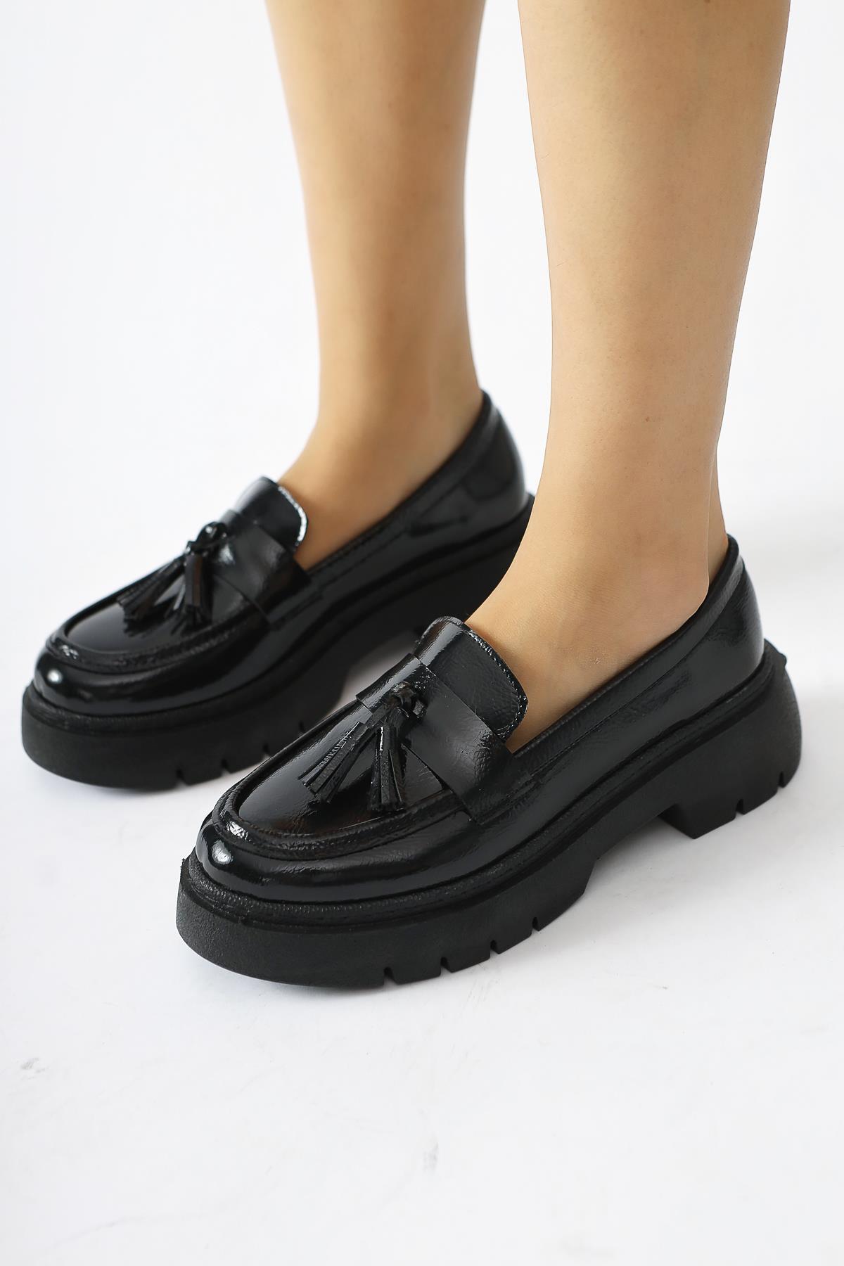 Linni Siyah Kırışık Rugan Püsküllü Makosen Ayakkabı