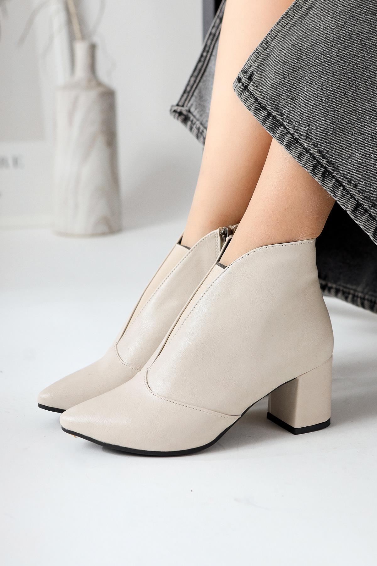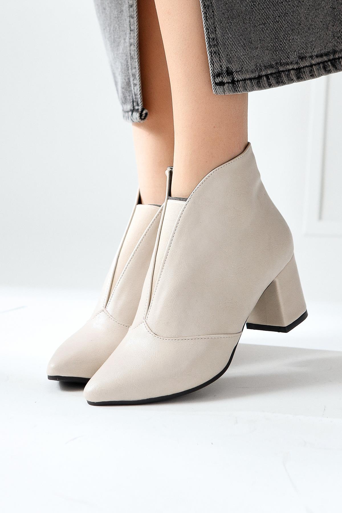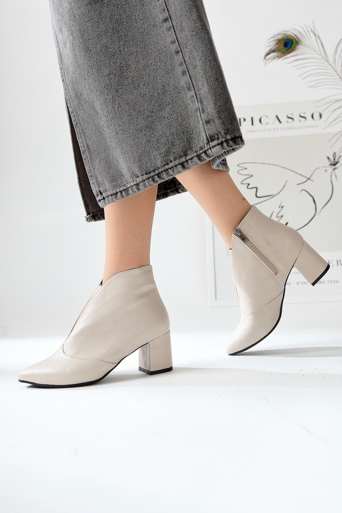 Maria Elena Bej Sivri Burunlu Fermuarlı Topuklu Bot