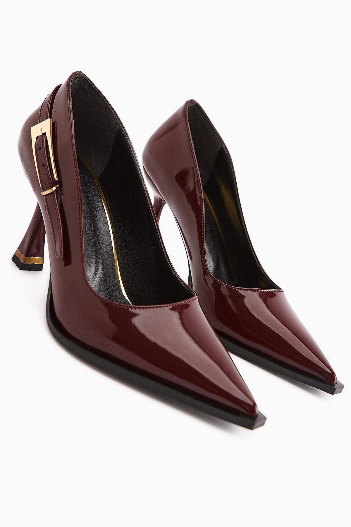 Mithra Bordo Rugan Sivri Burunlu Toka Detaylı Topuklu Ayakkabı