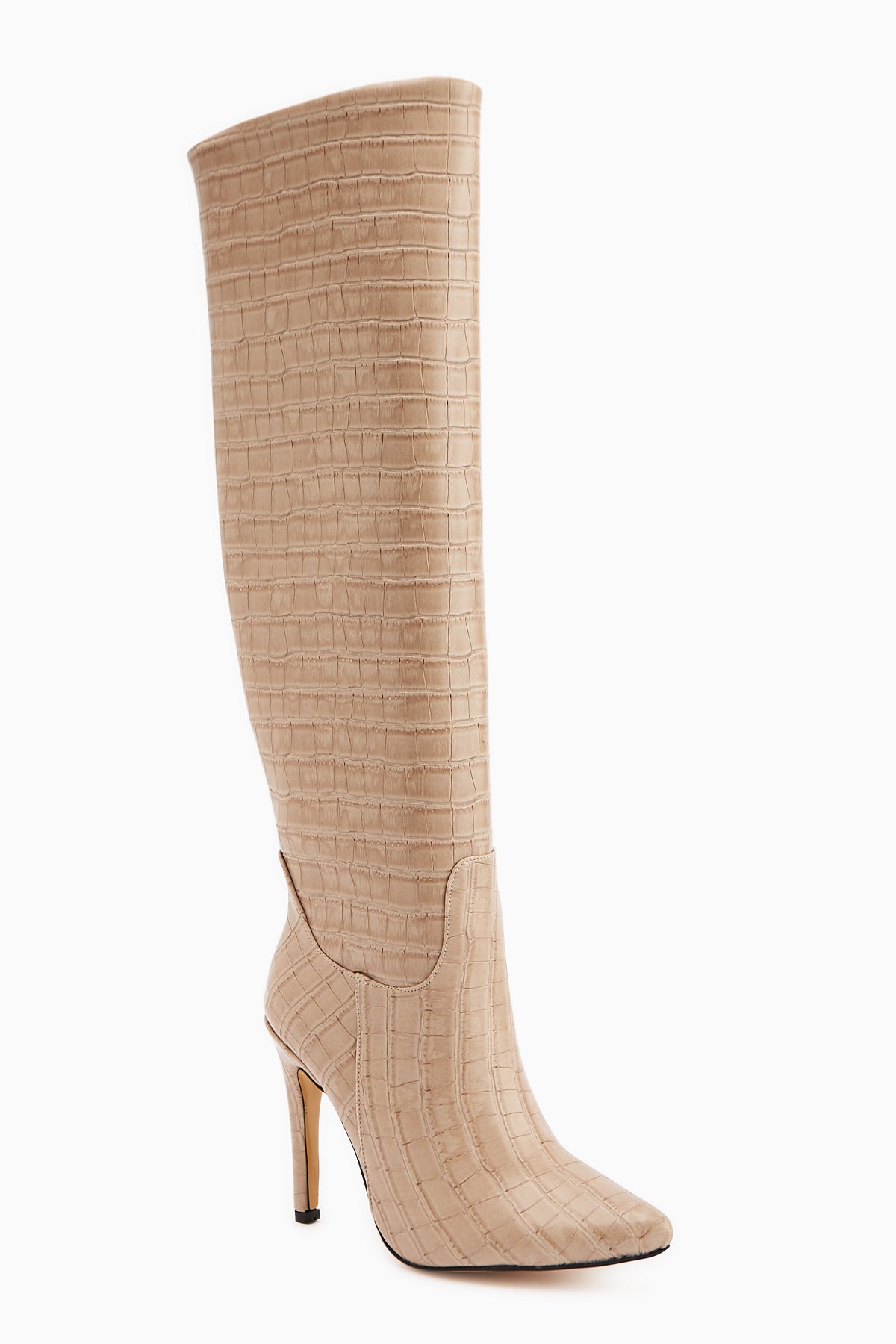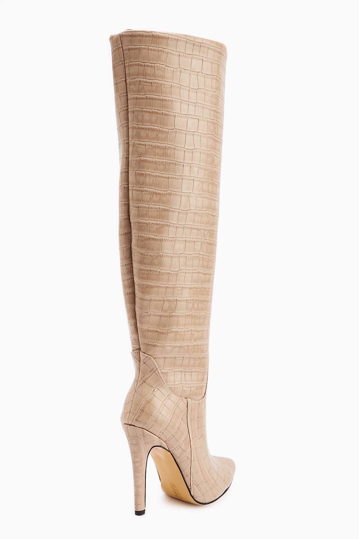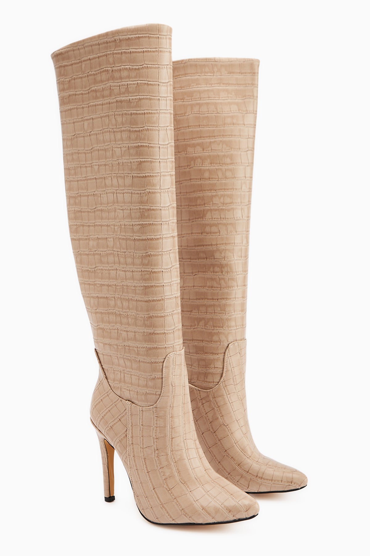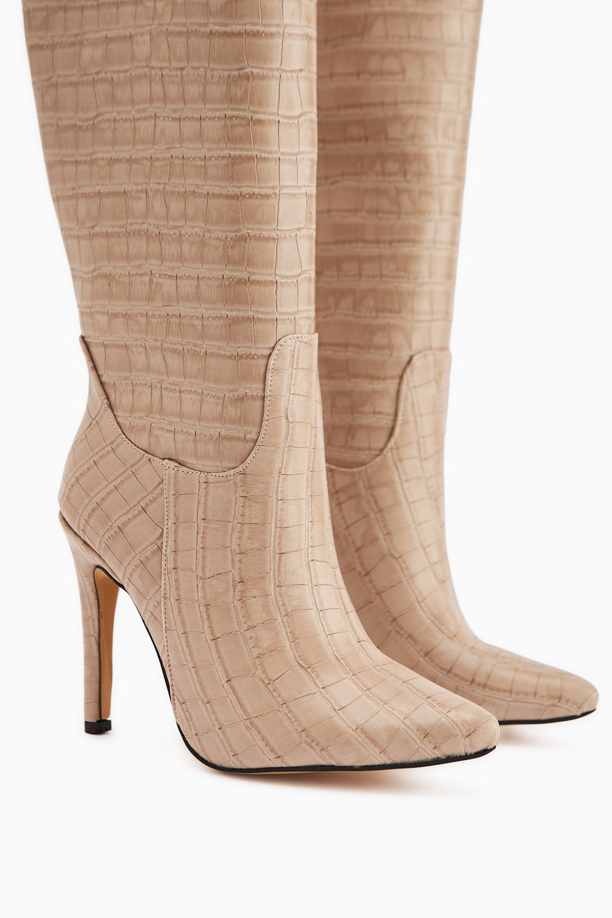 Nenya Bej Kroko Desenli Sivri Burunlu İnce Topuklu Dizüstü Çizme