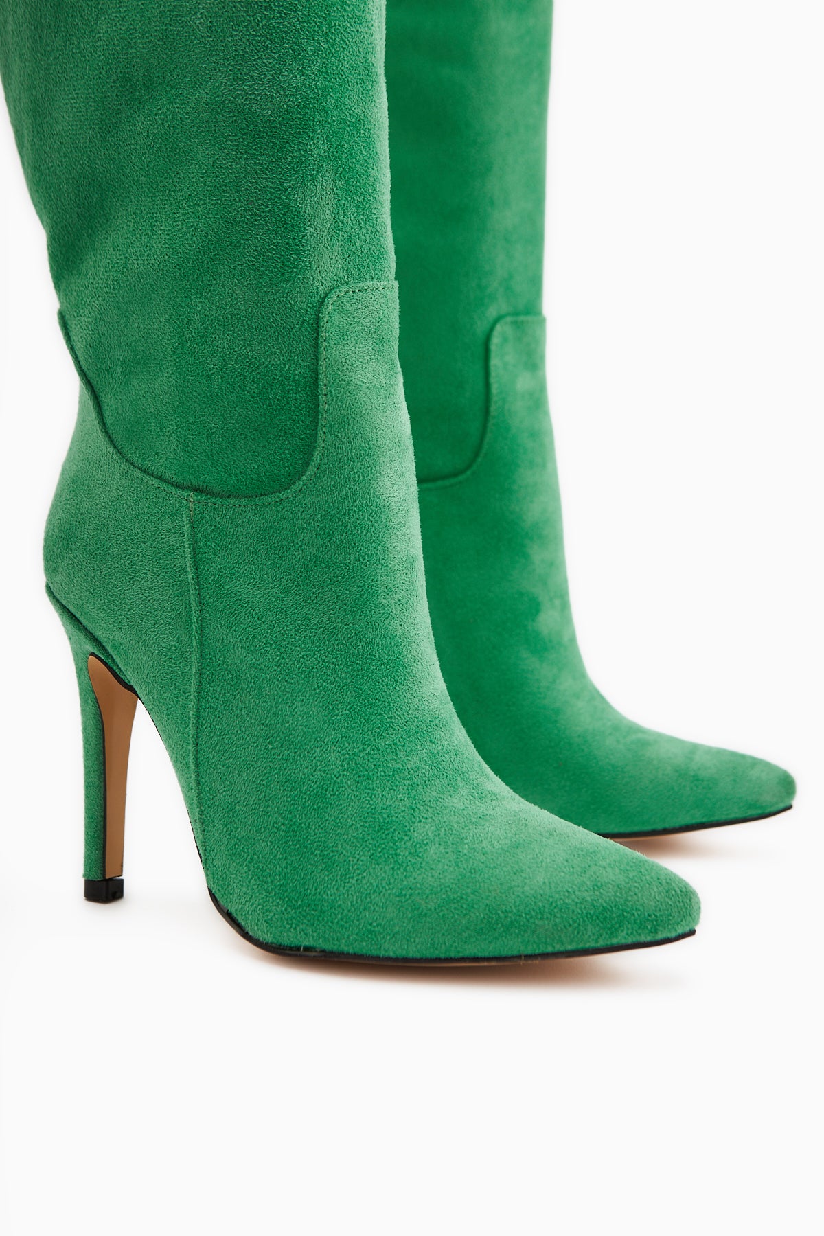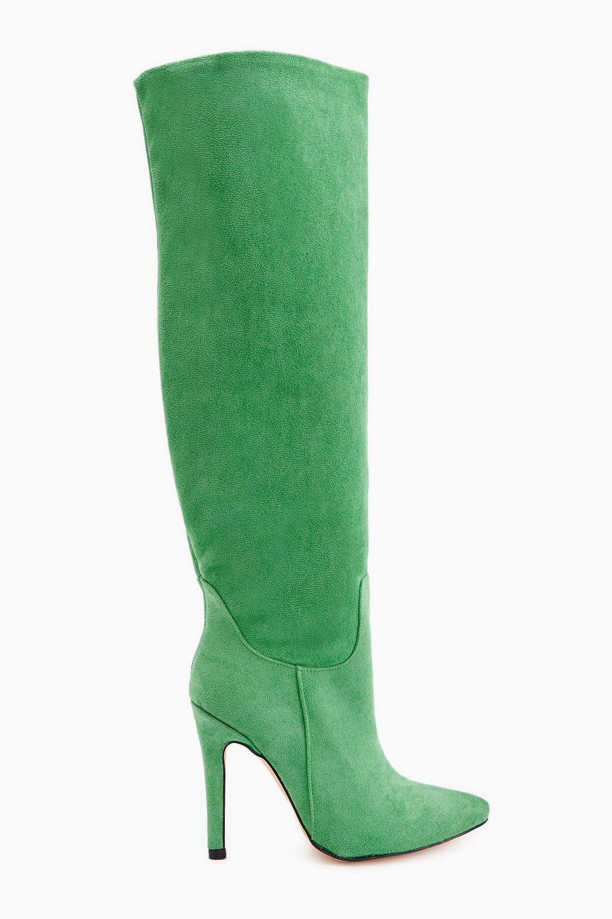 Nenya Yesil Süet Desenli Sivri Burunlu İnce Topuklu Dizüstü Çizme