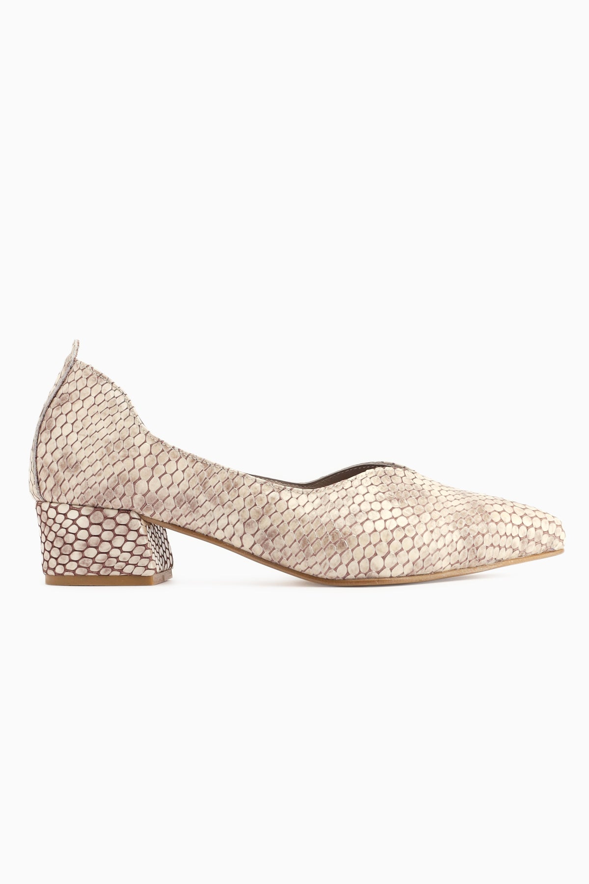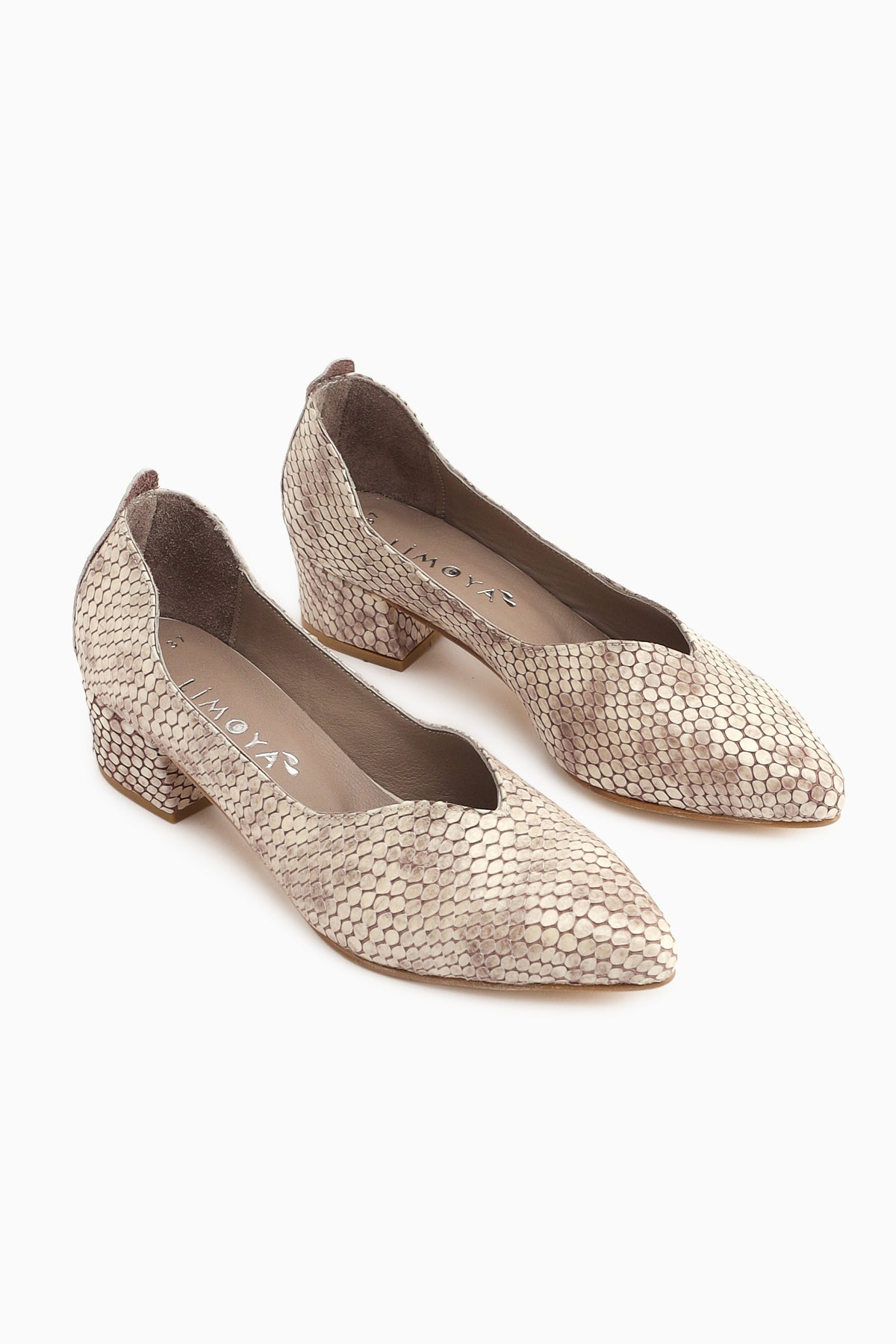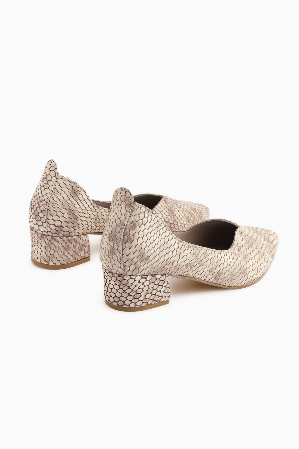 Samia Hakiki Deri Bej Yılan Desenli Kalın Topuklu Kadın Ayakkabı