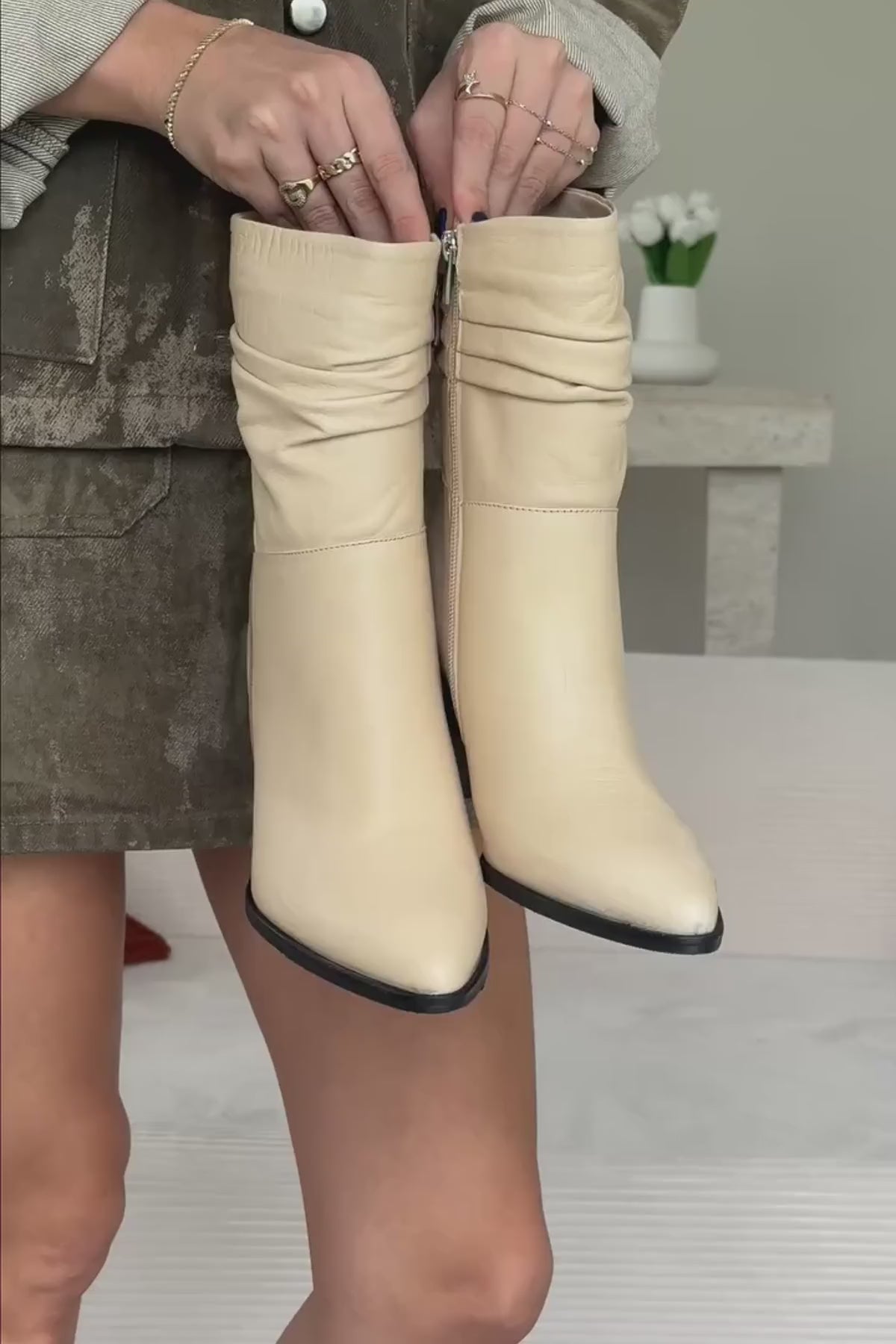 Tamina Hakiki Deri Bej Sivri Burunlu Topuklu Kadın Bot