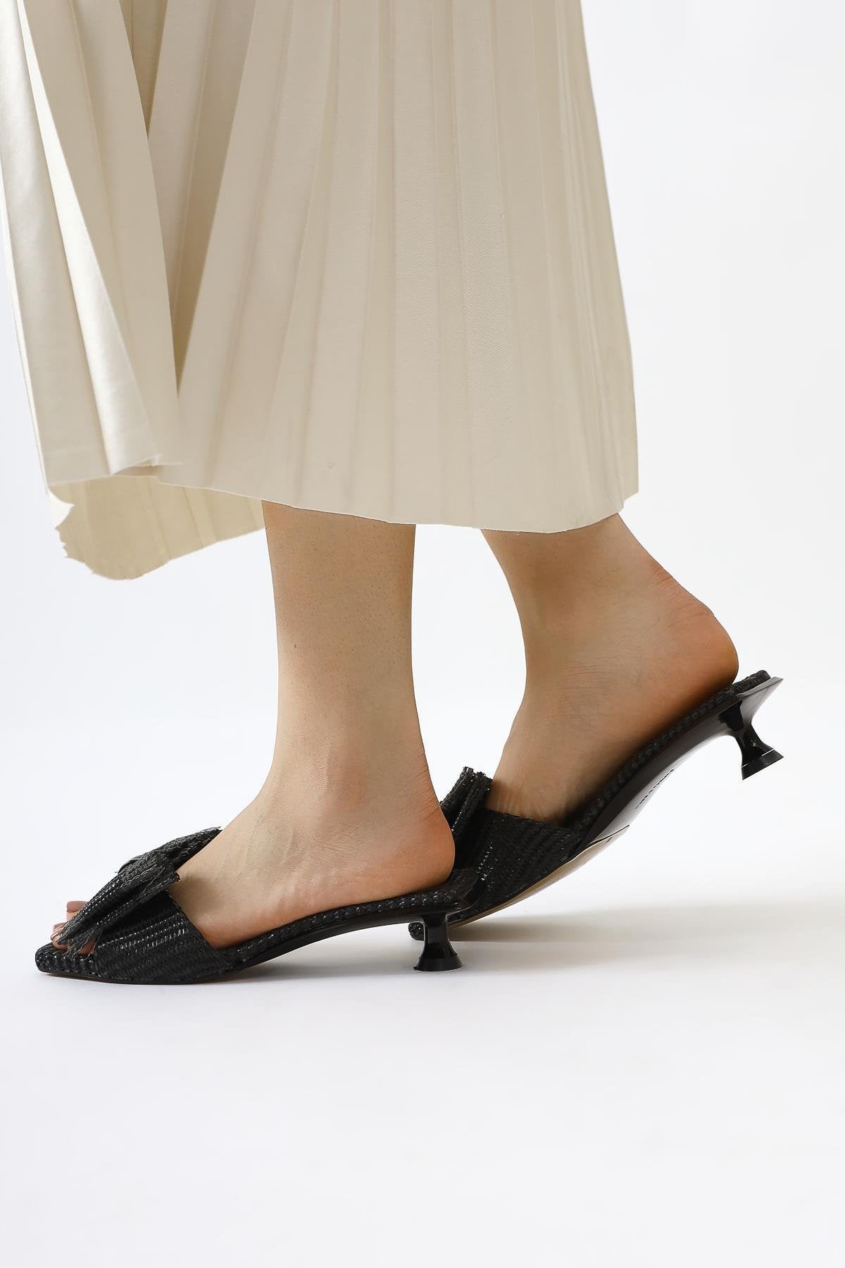 Tonka Siyah Hasır Fiyonk Bantlı Kısa Topuklu Terlik